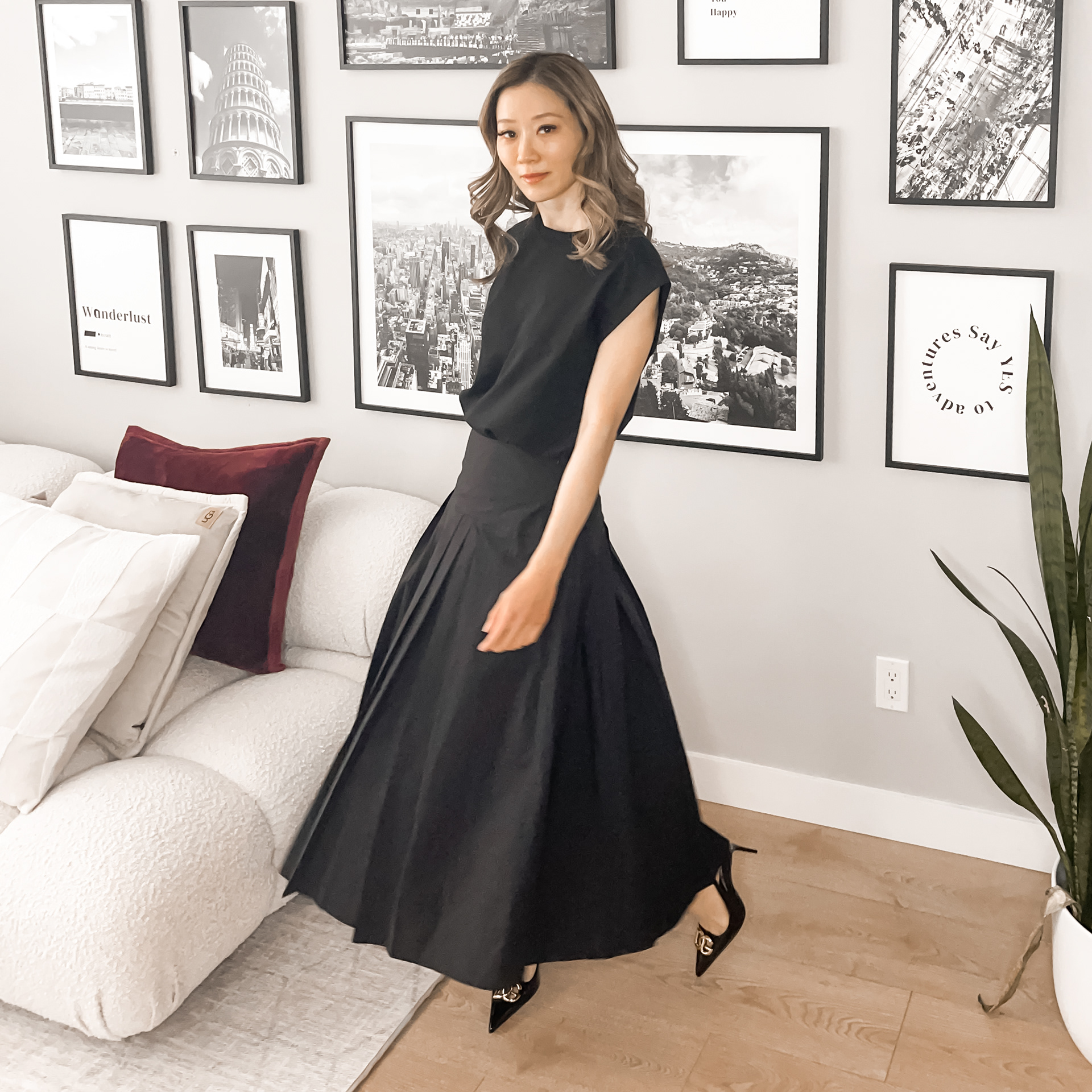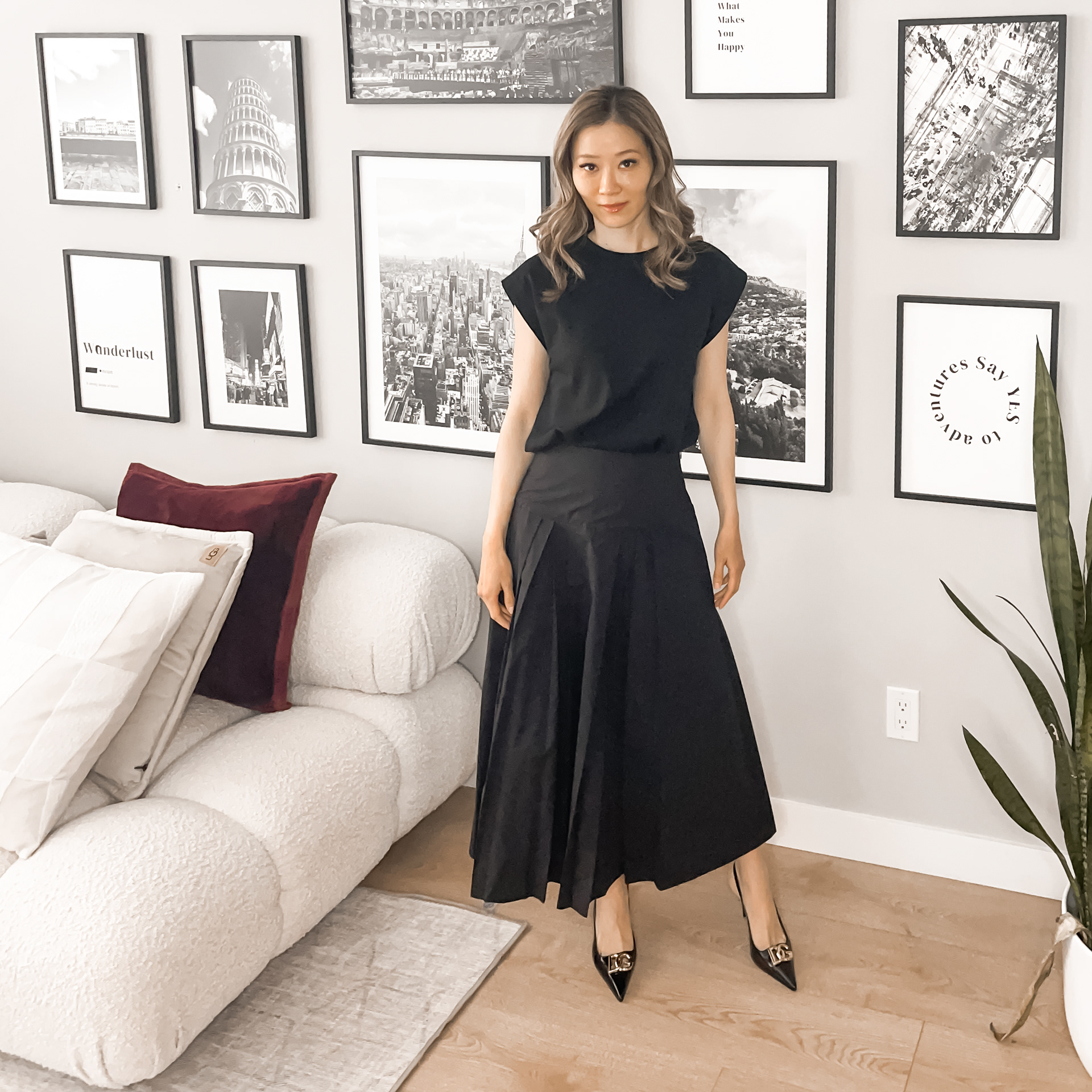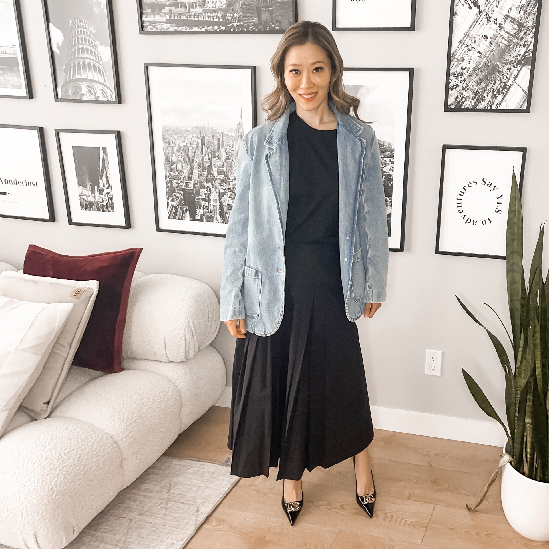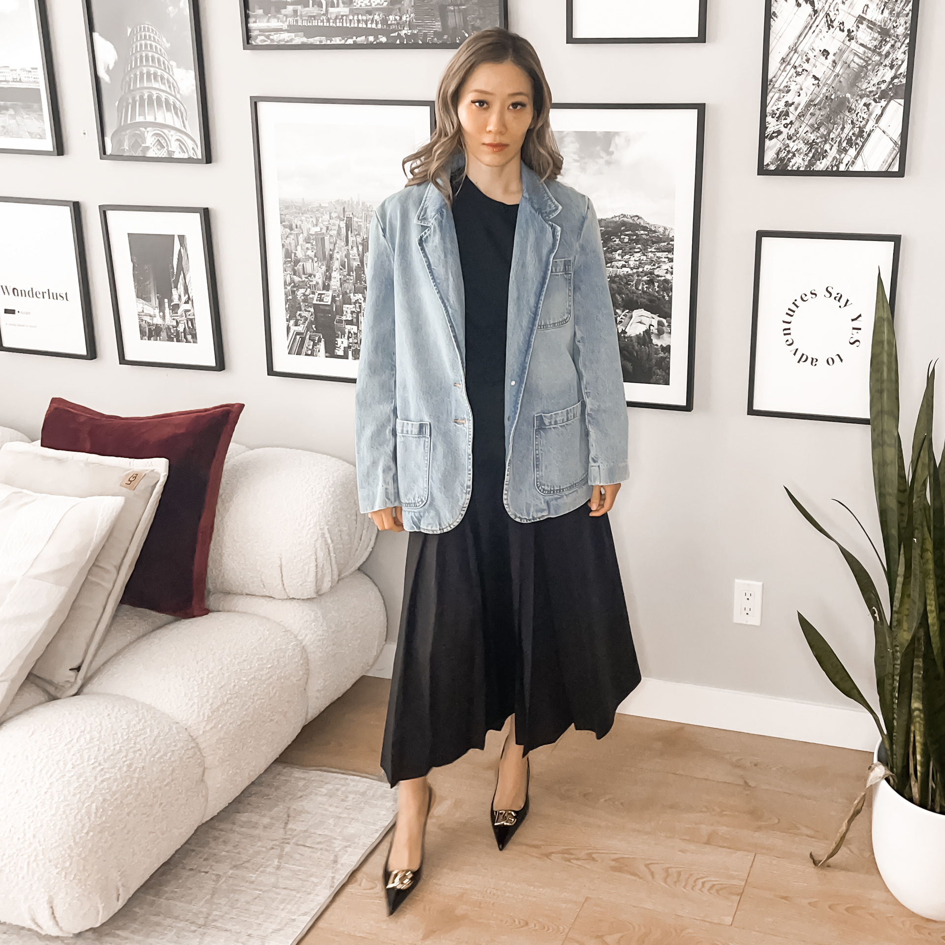 Loving how the oversized denim blazer adds a relaxed, vintage touch, balancing the sleekness of the all-black ensemble. The pleated midi skirt brings movement and elegance, while the pointed-toe heels with gold details elevate the outfit with a polished finish. Perfectly curated for a modern, sophisticated vibe with a hint of cool nonchalance.