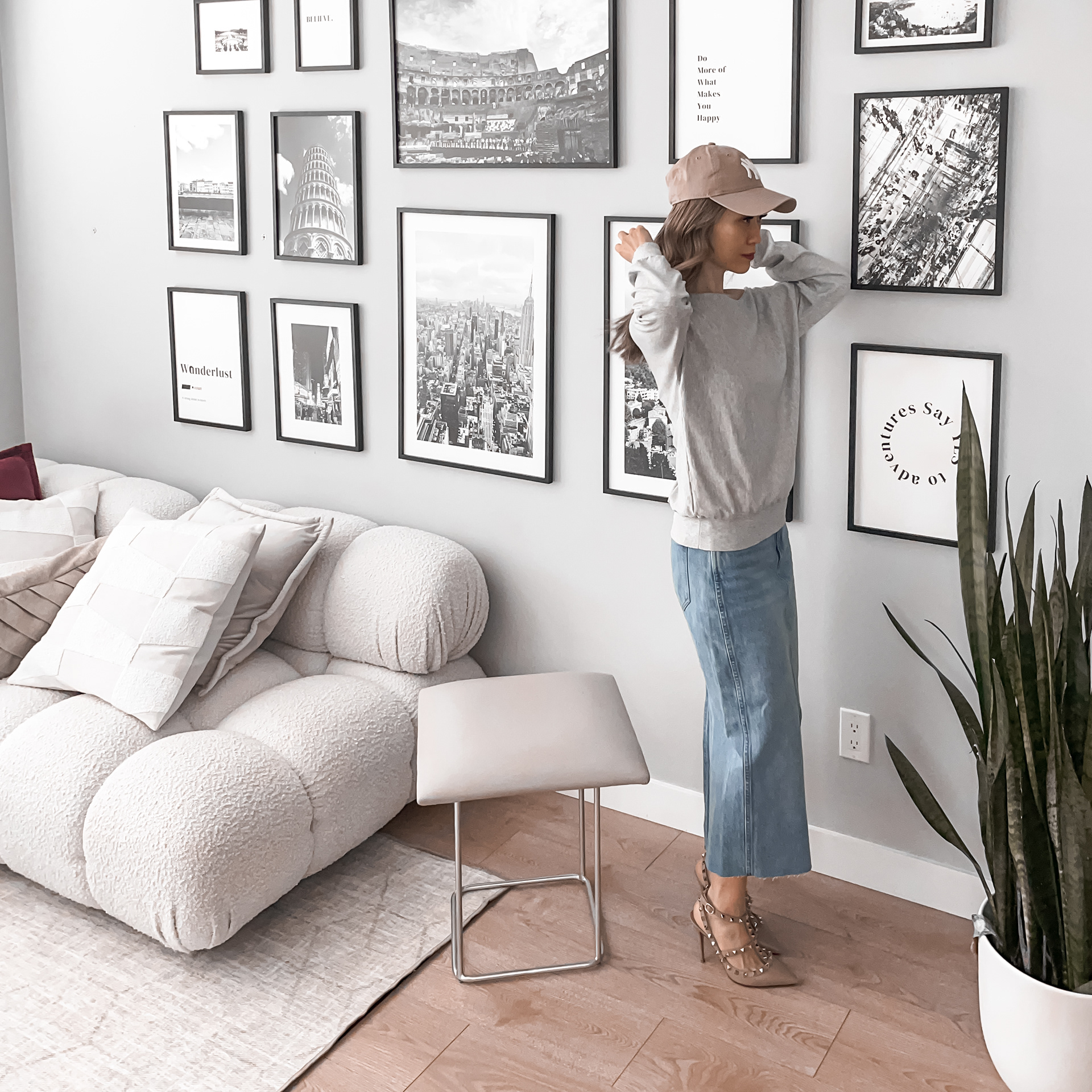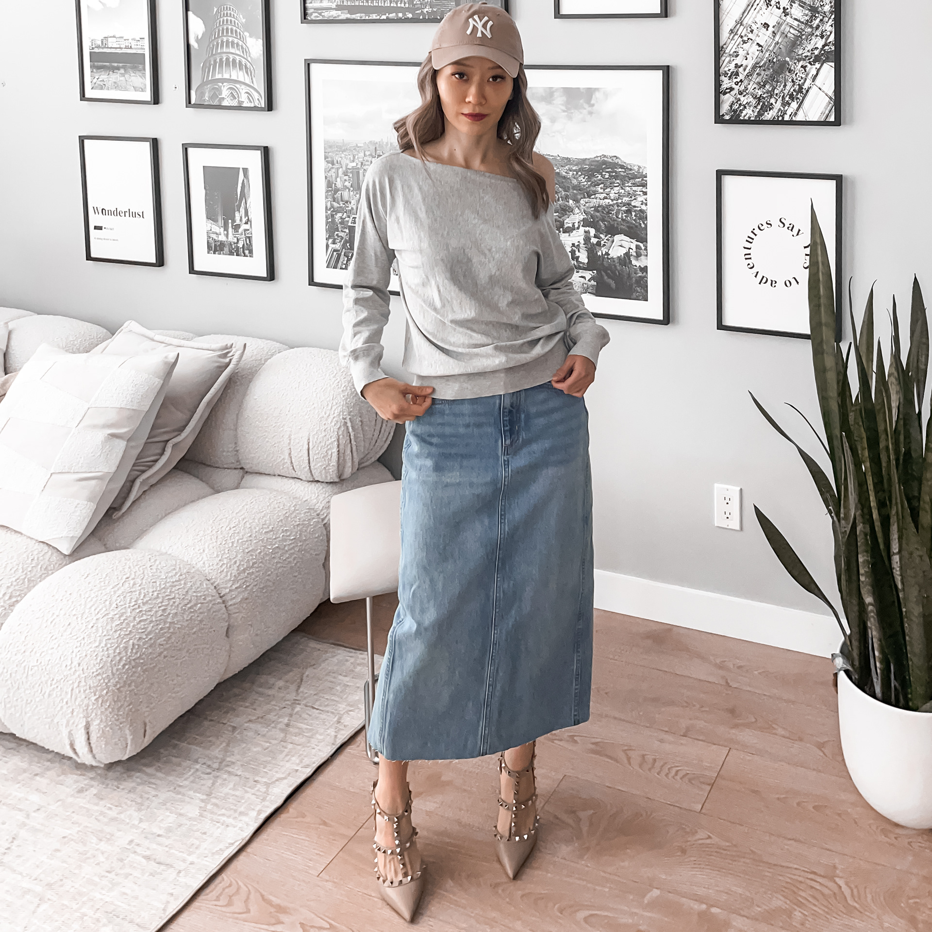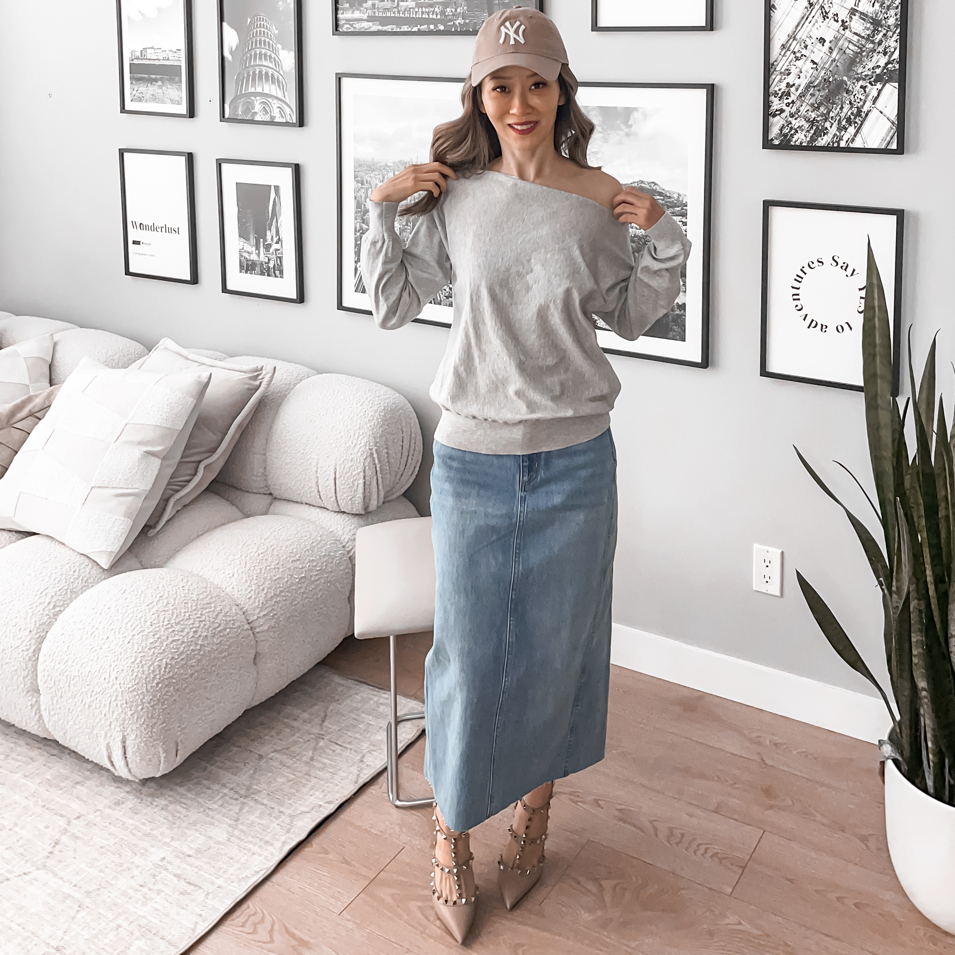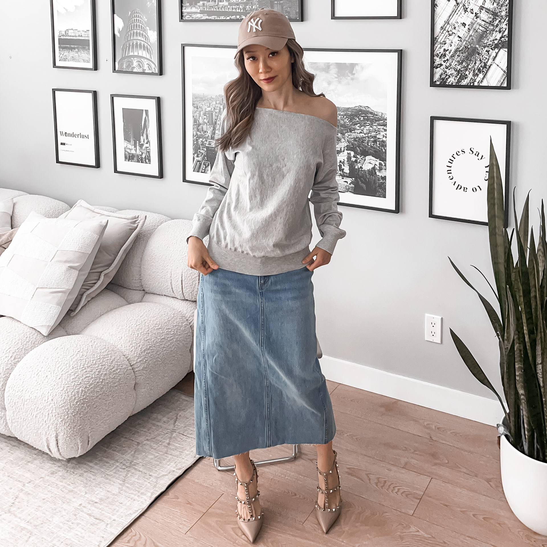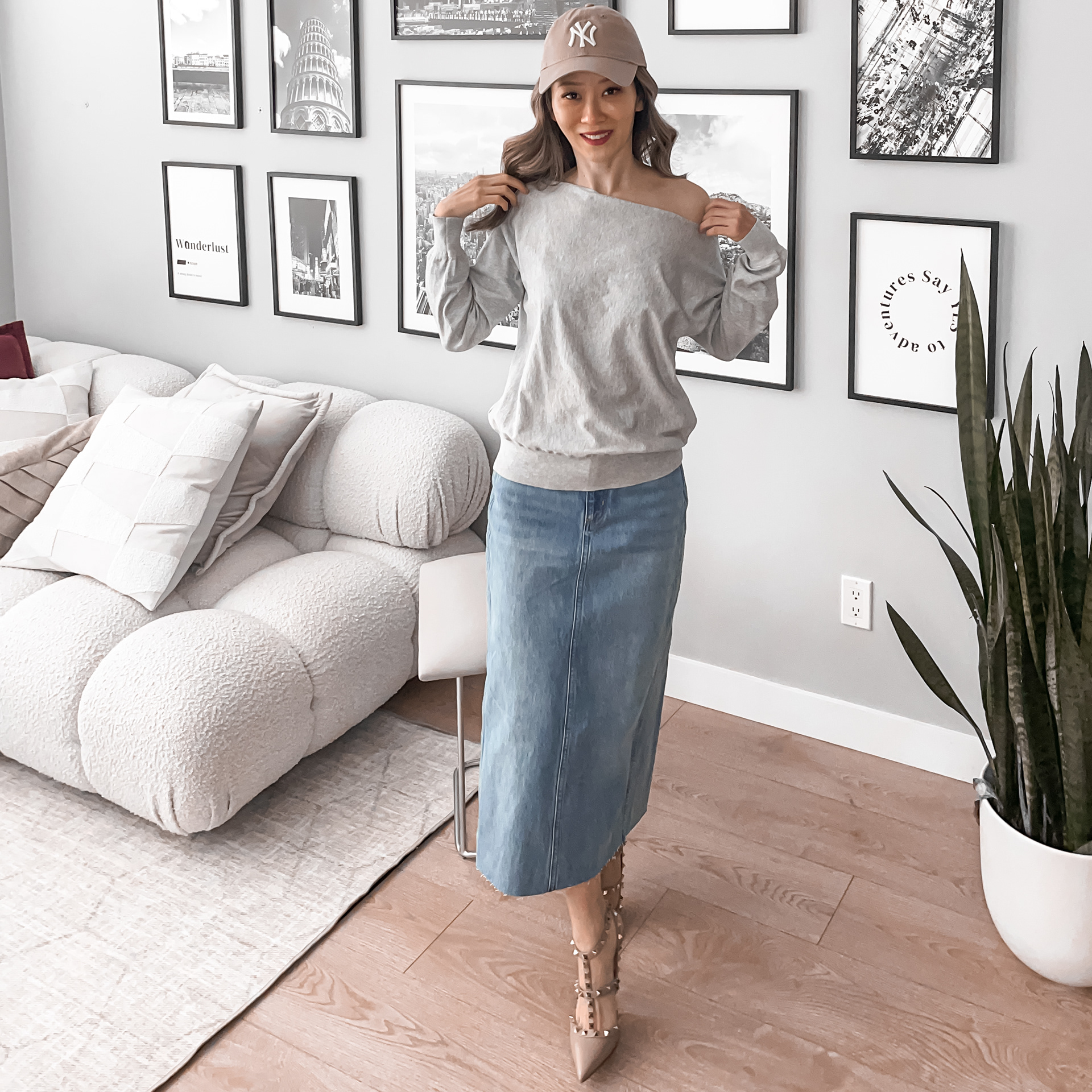 Wearing the off-shoulder sweatshirt that adds effortless allure. The denim midi skirt keeps it casual yet polished. A neutral NY cap brings relaxed energy, perfectly balanced by studded heels that add an unexpected touch of glam. A combo of relaxed vibe and sophistication.