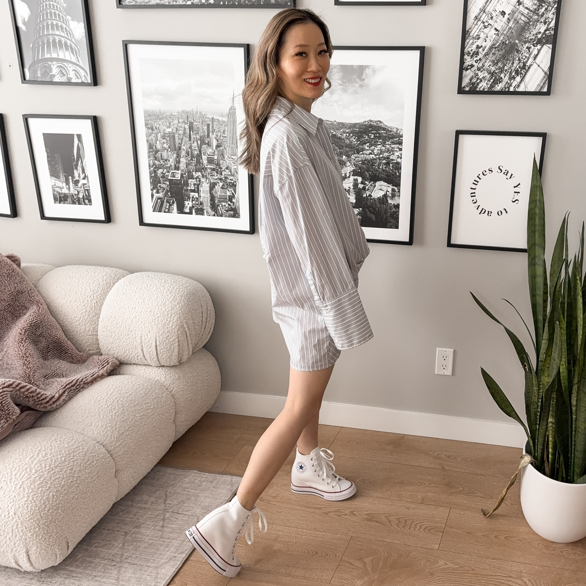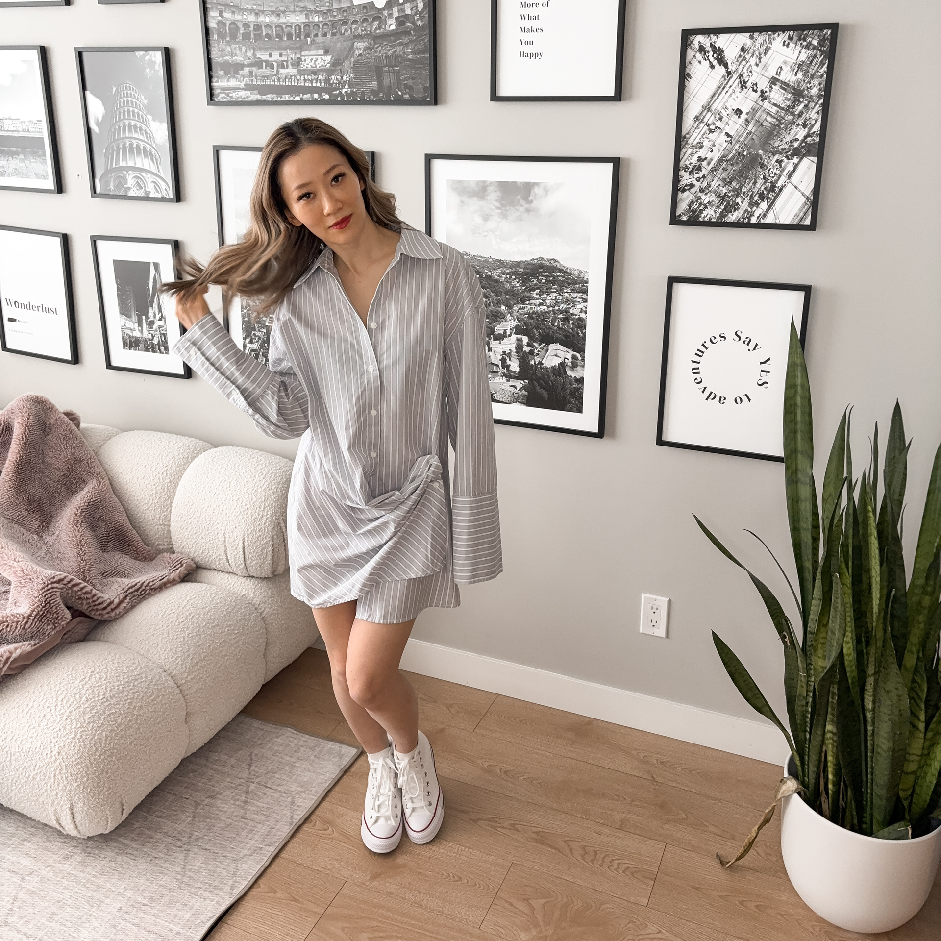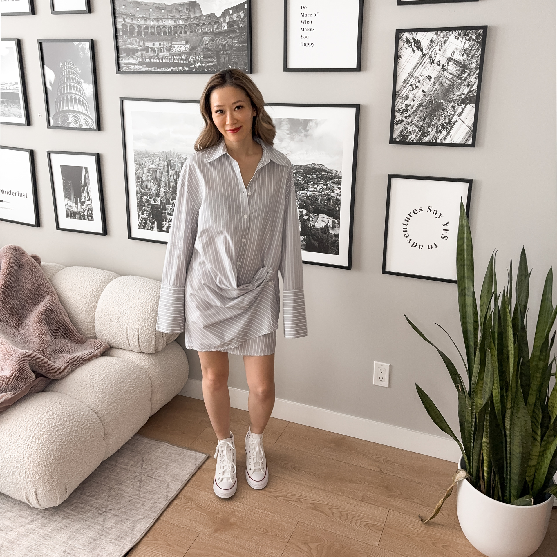 Wearing the light blue, striped button-up shirt dress with pleated detail, which adds a playful yet polished vibe. The loose, oversized fit keeps it relaxed. Paired with classic white high-top sneakers, the outfit strikes a perfect balance of comfort and style.