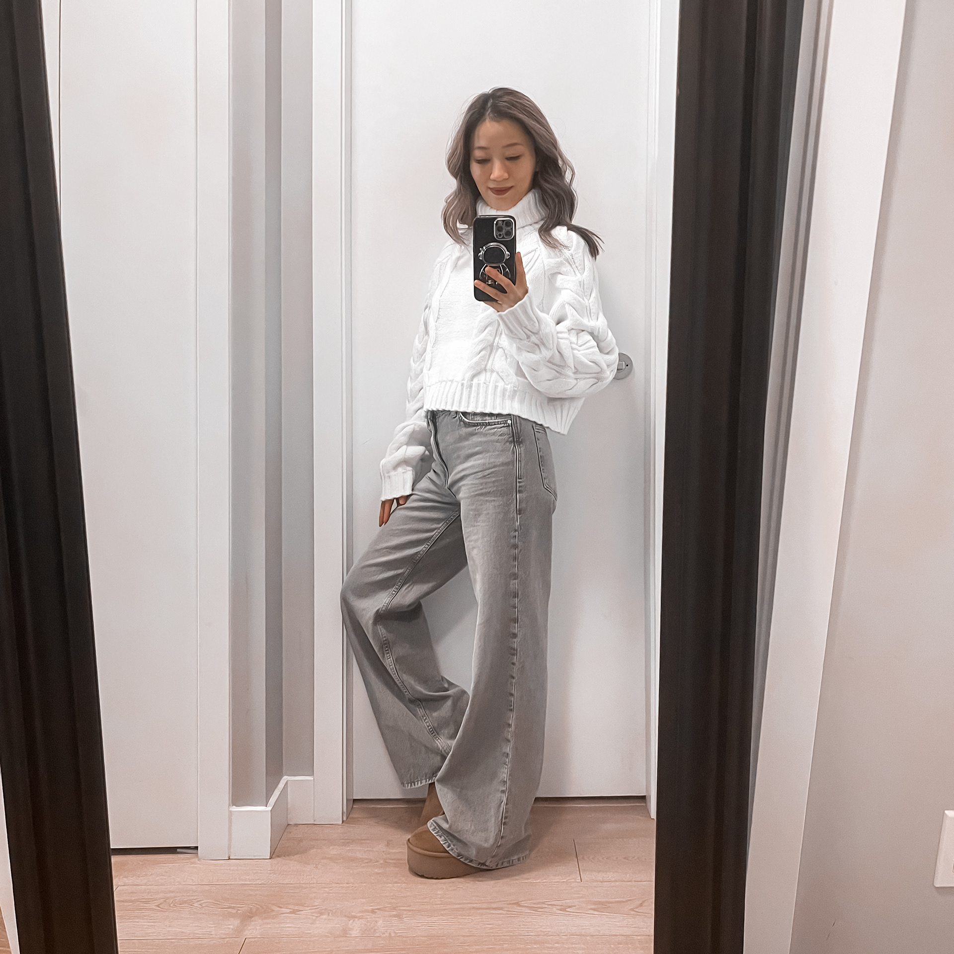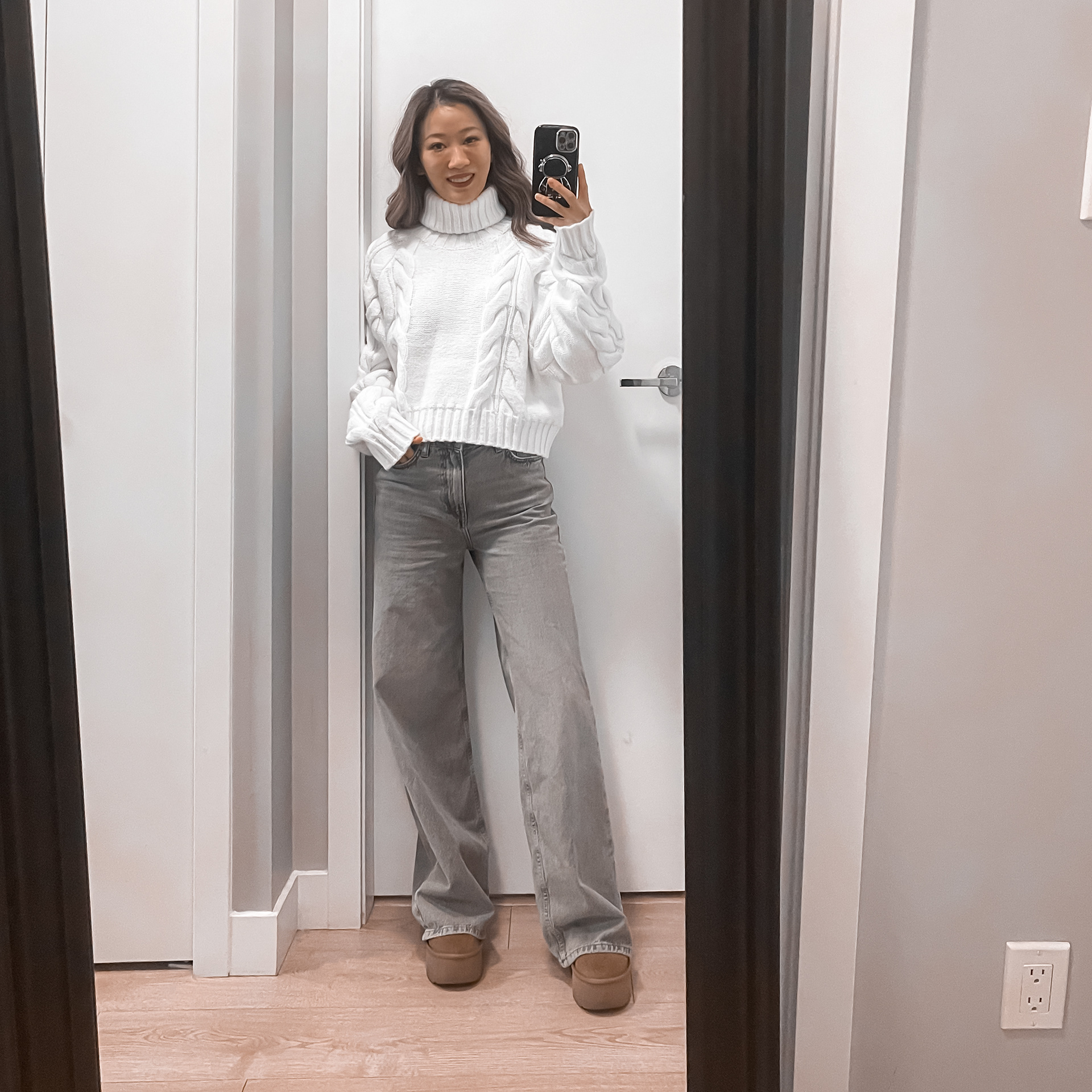 A chunky white turtleneck sweater paired with gray wide-leg jeans and platform boots for a relaxed, effortlessly street vibe.