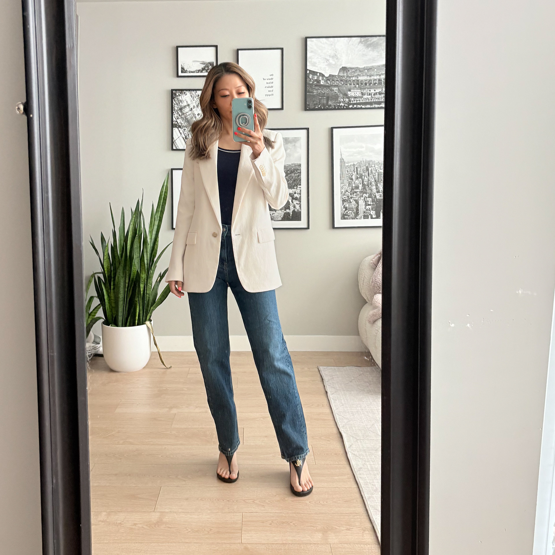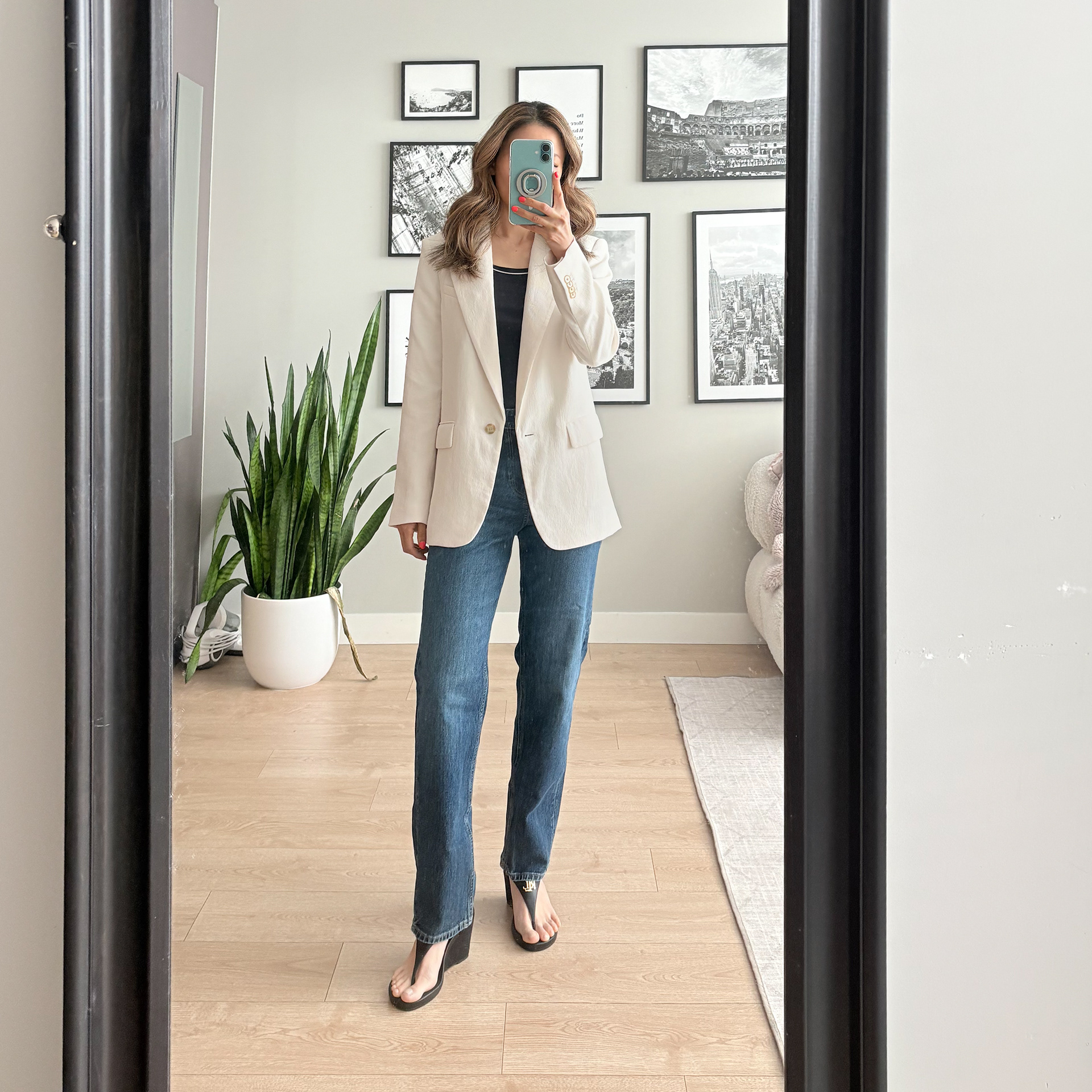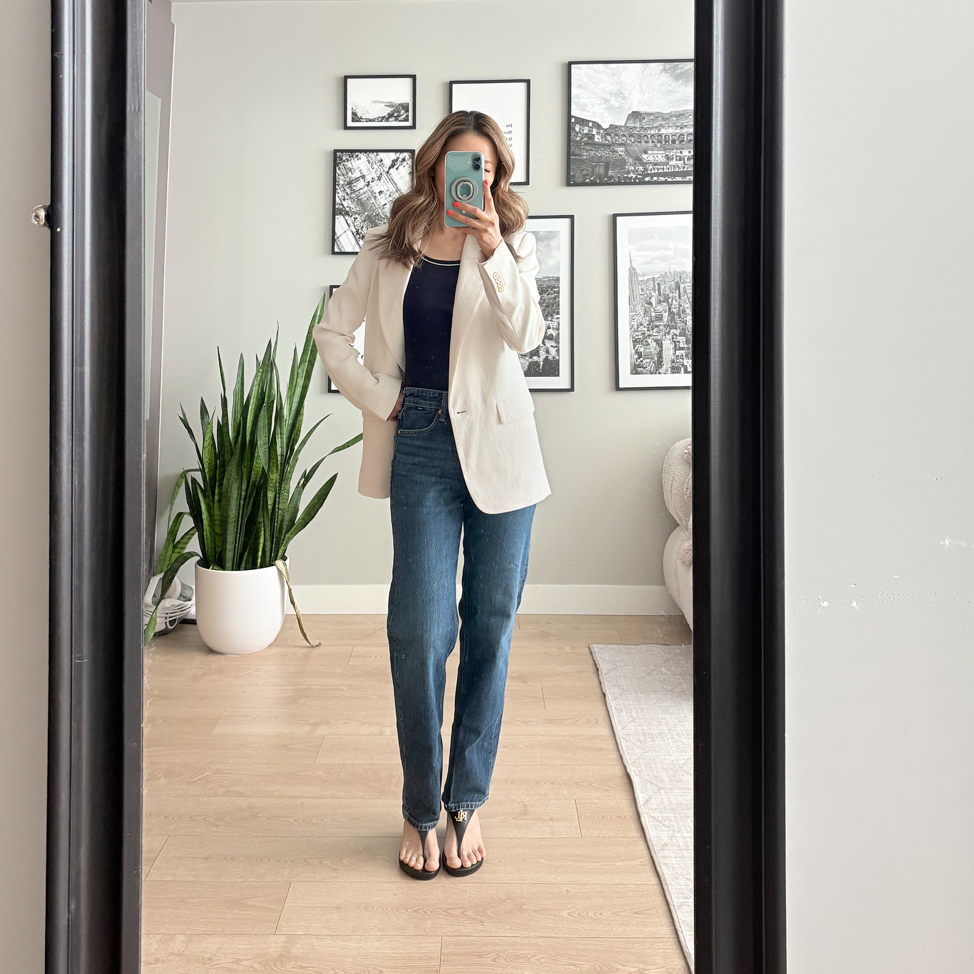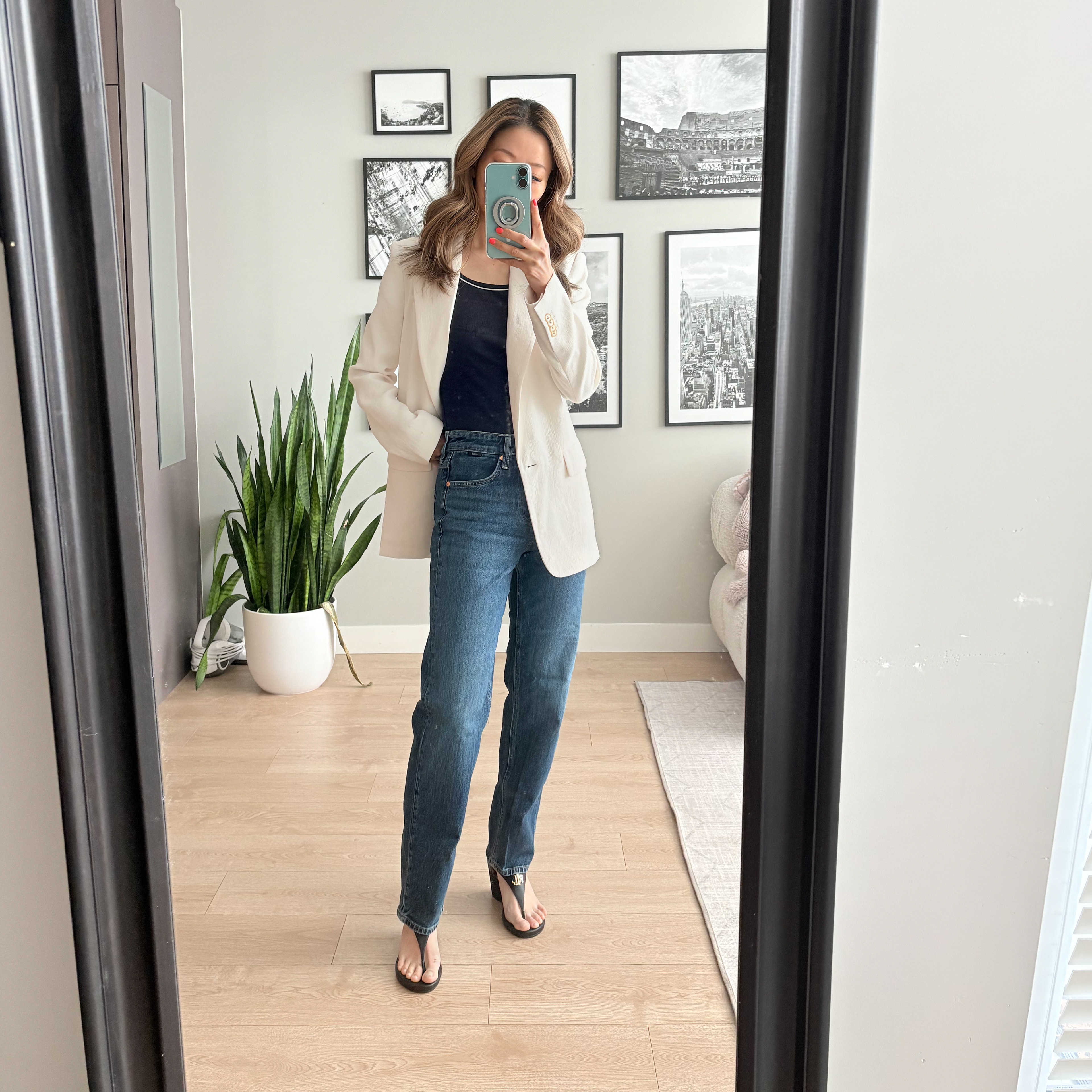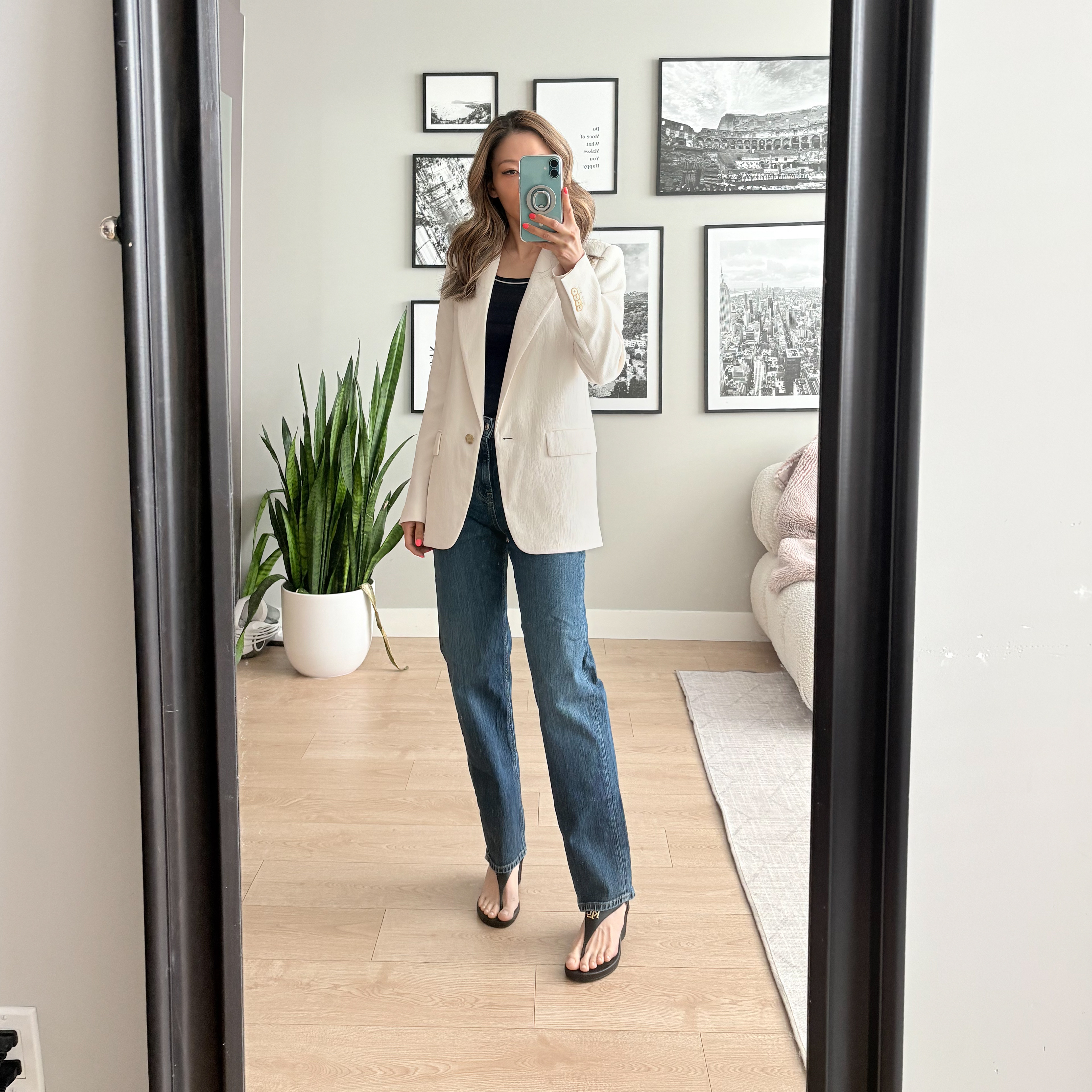 I always opt for more creamy or ivory colours in the Spring and Summer. Wearing the structured ivory blazer layered over a sleek black tank, paired with classic straight-leg denim and finished with minimalist sandals. Perfect for casual downtown coffee runs.