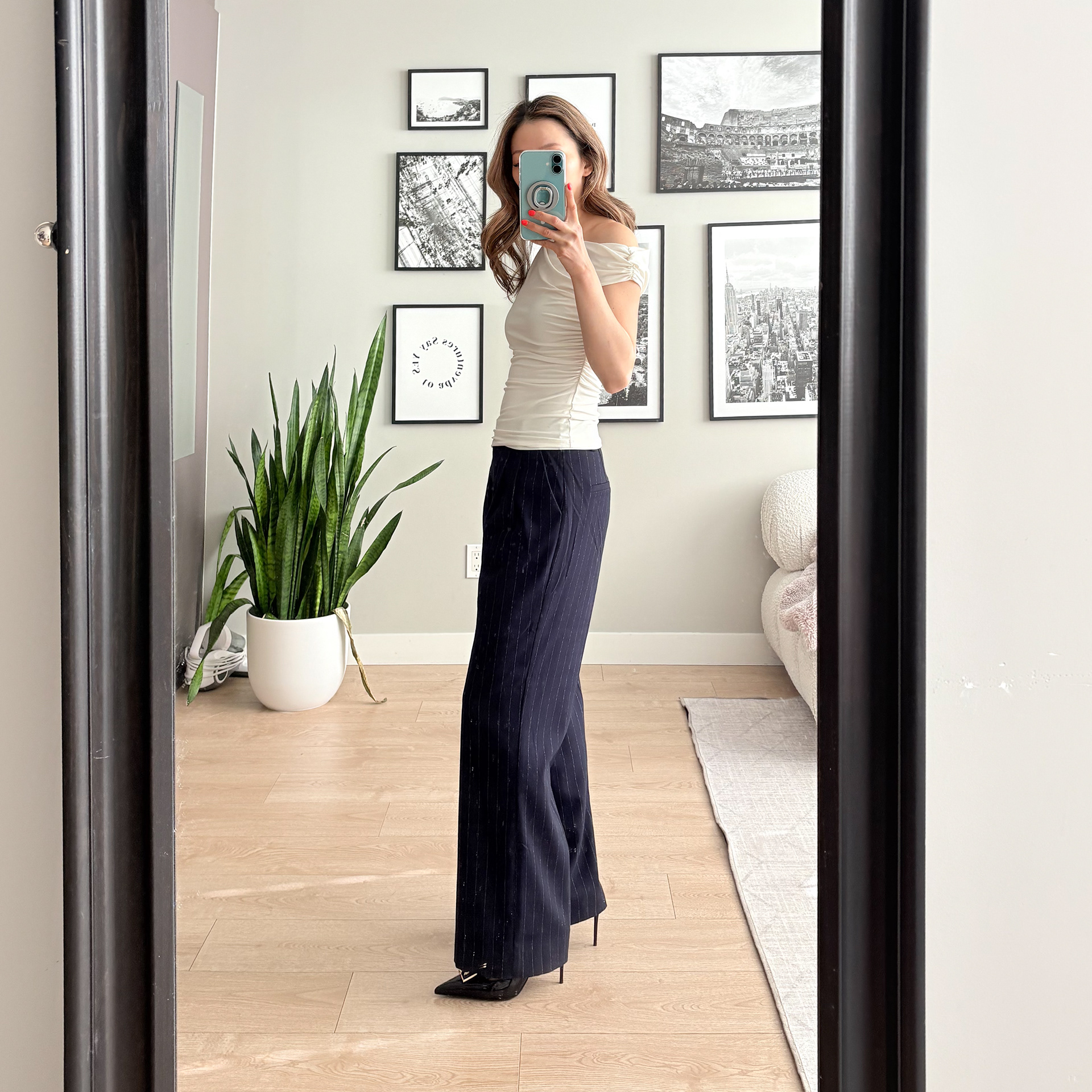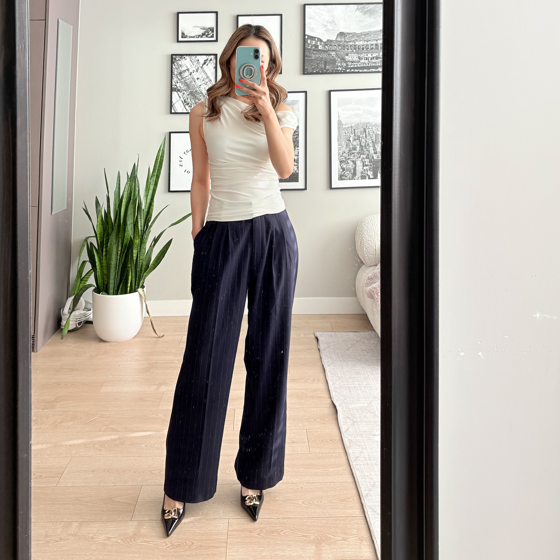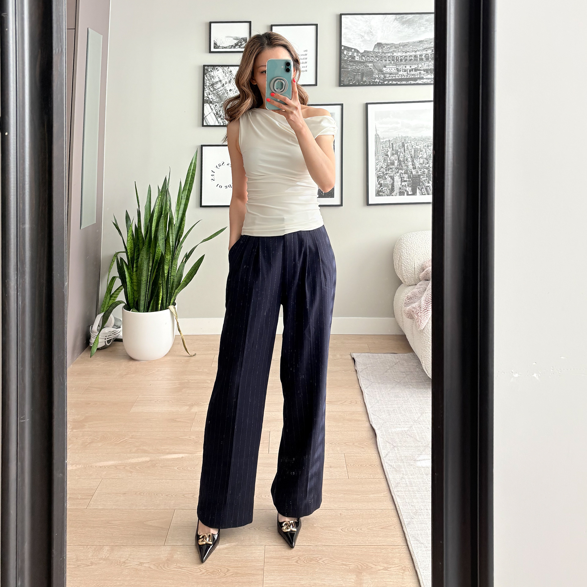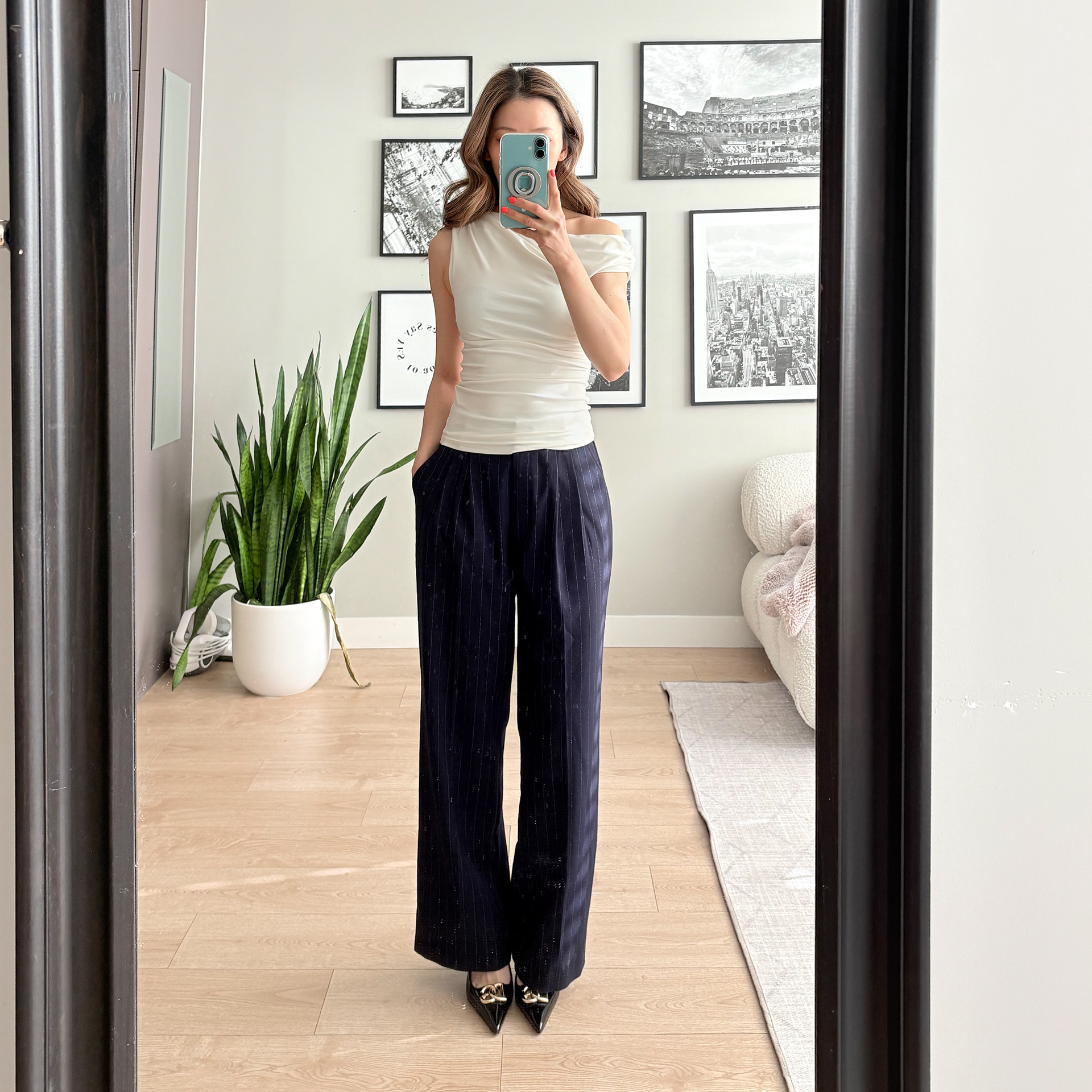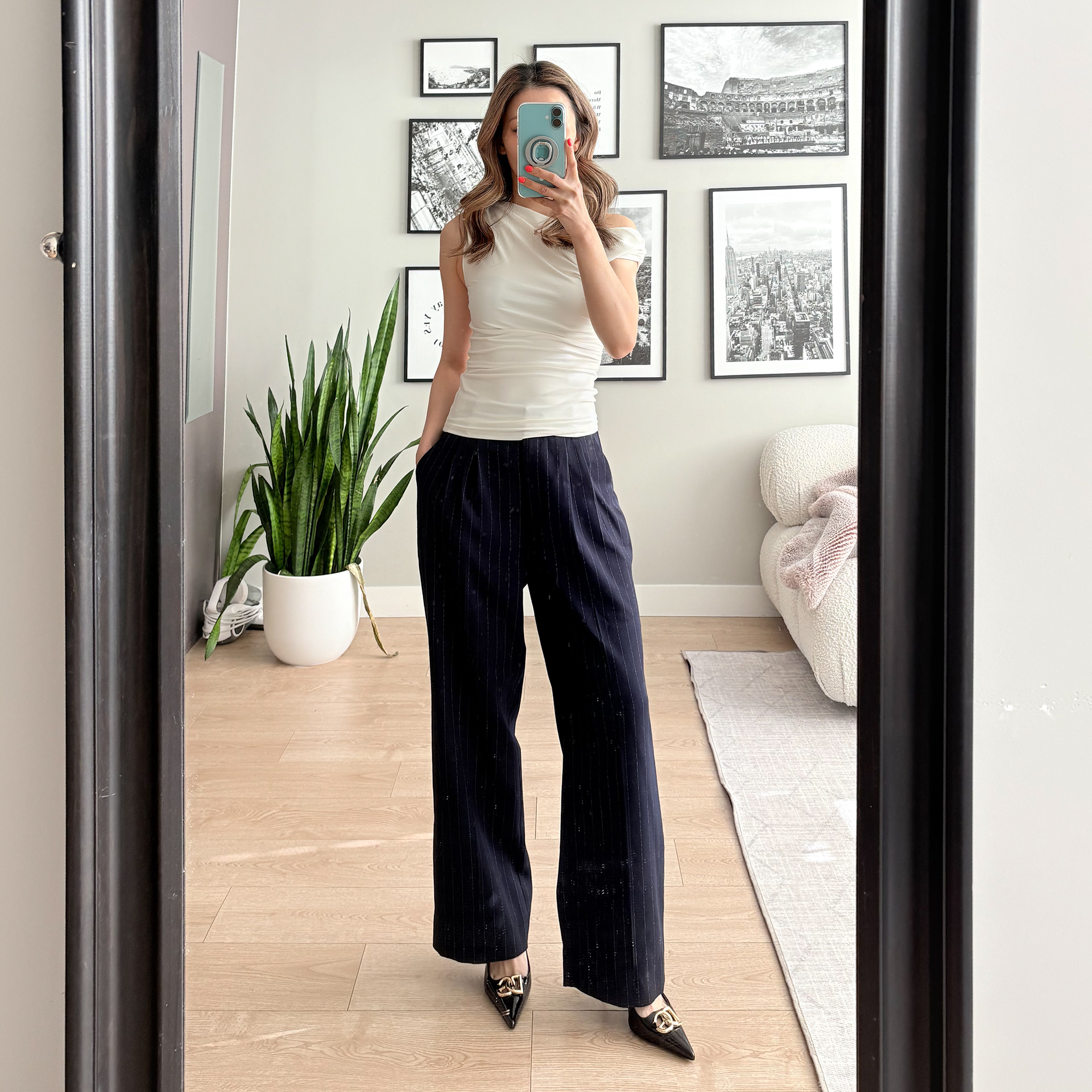 Absolutely the asymmetric ruched top that adds an elegant touch, while the pinstriped wide-leg trousers bring a sophisticated, power-dressing vibe. Finished with pointed-toe heels for a sleek, polished look that’s perfect for a stylish day-to-night transition.