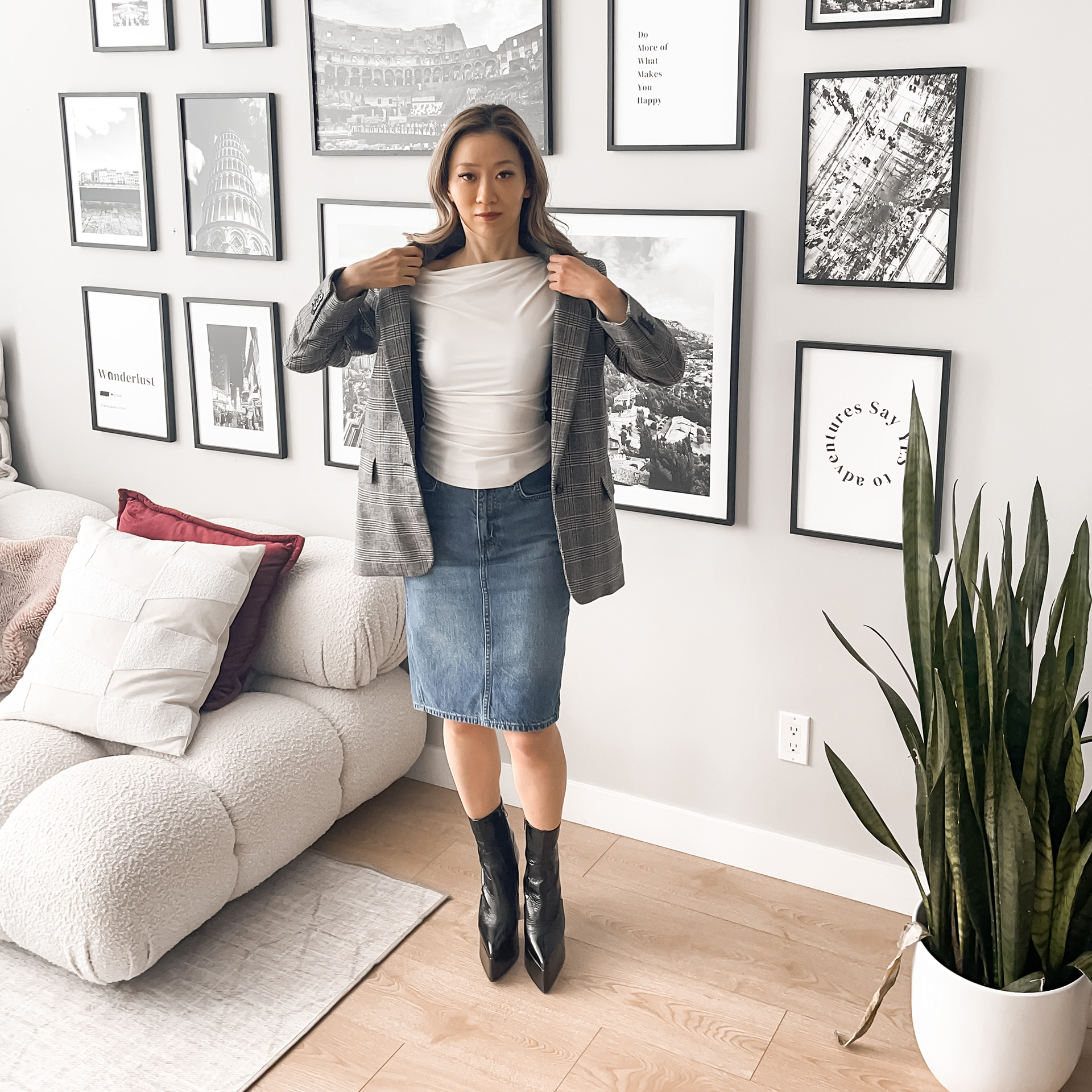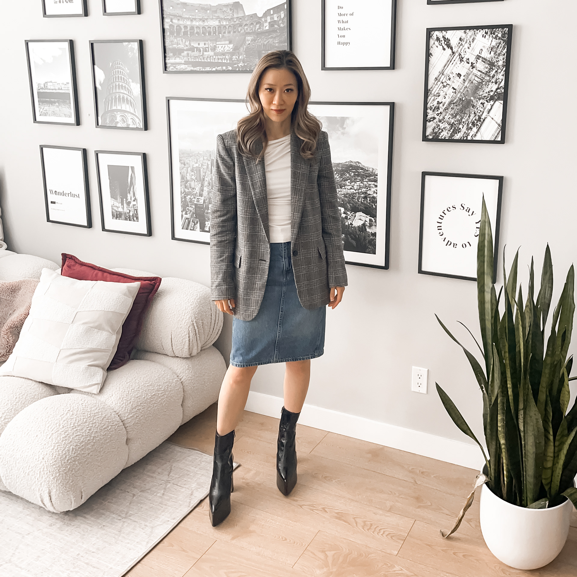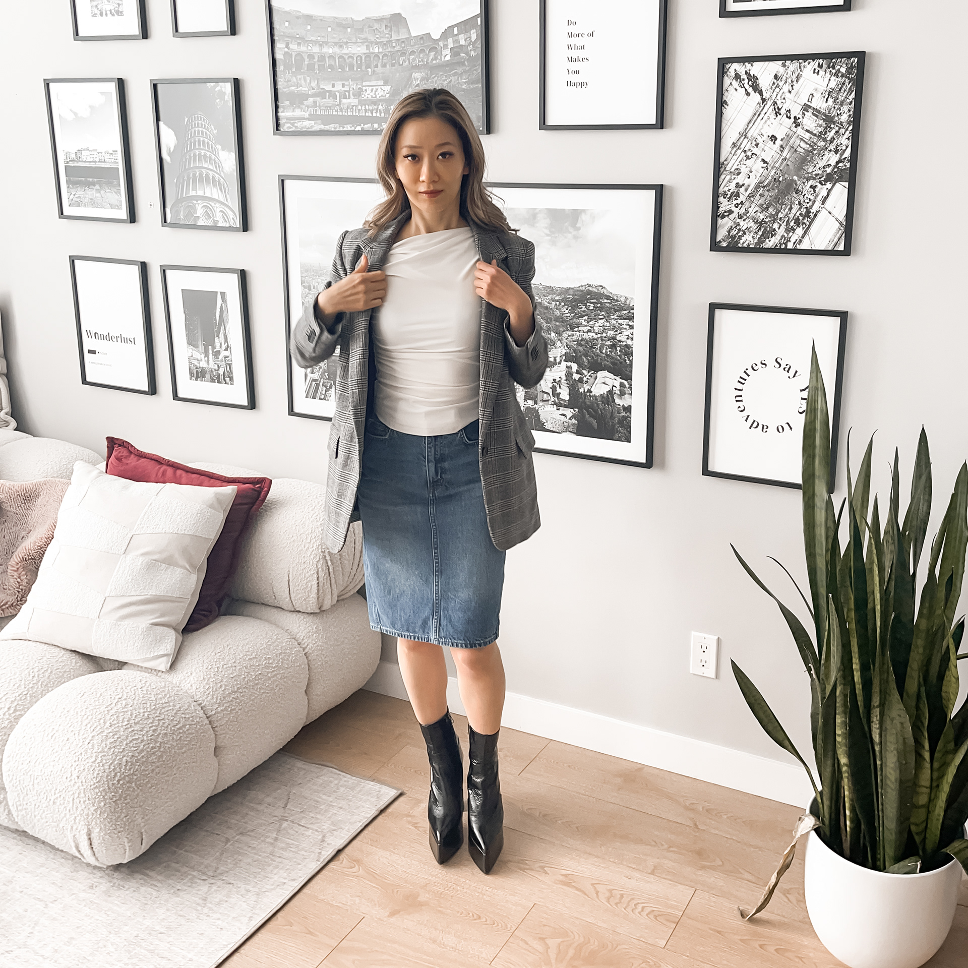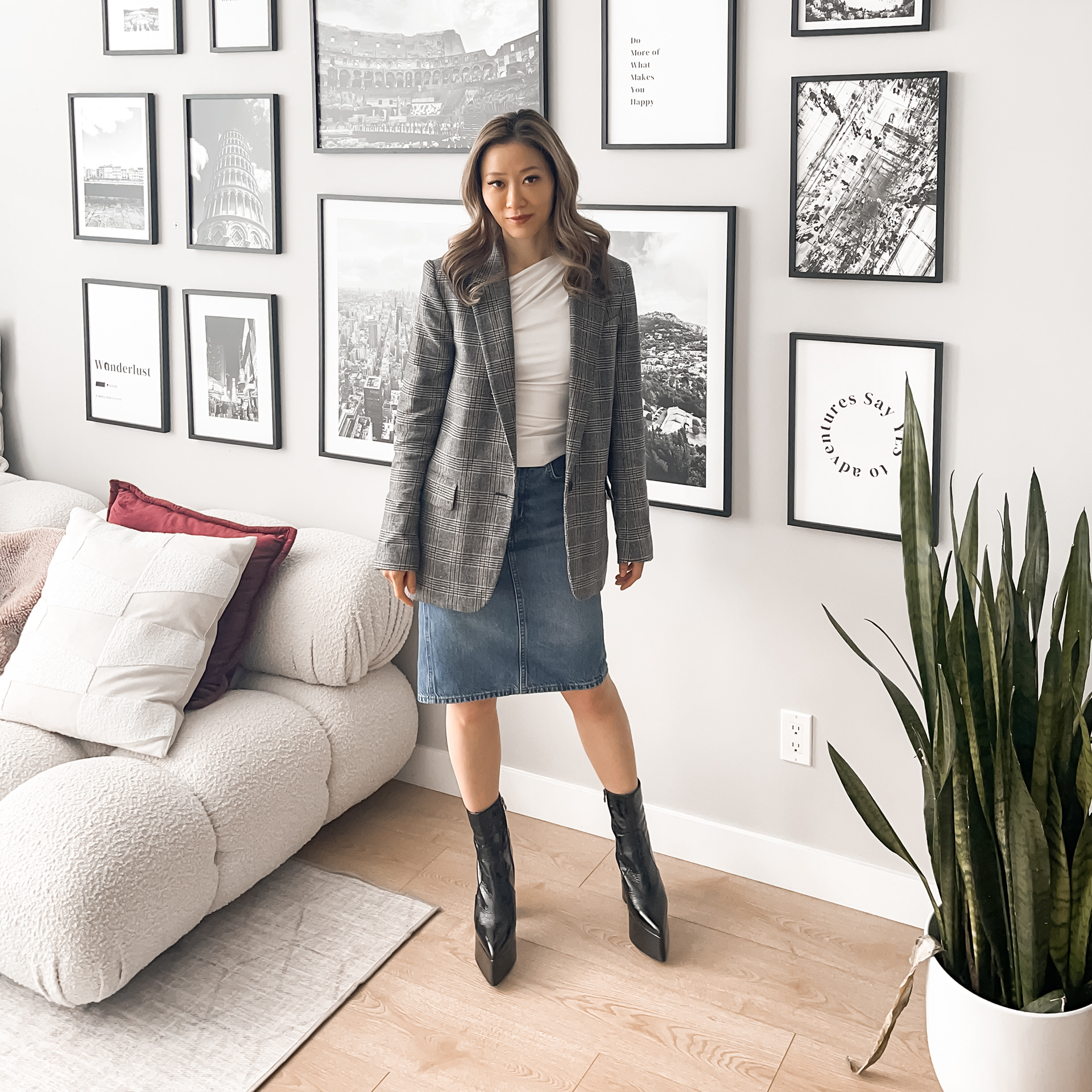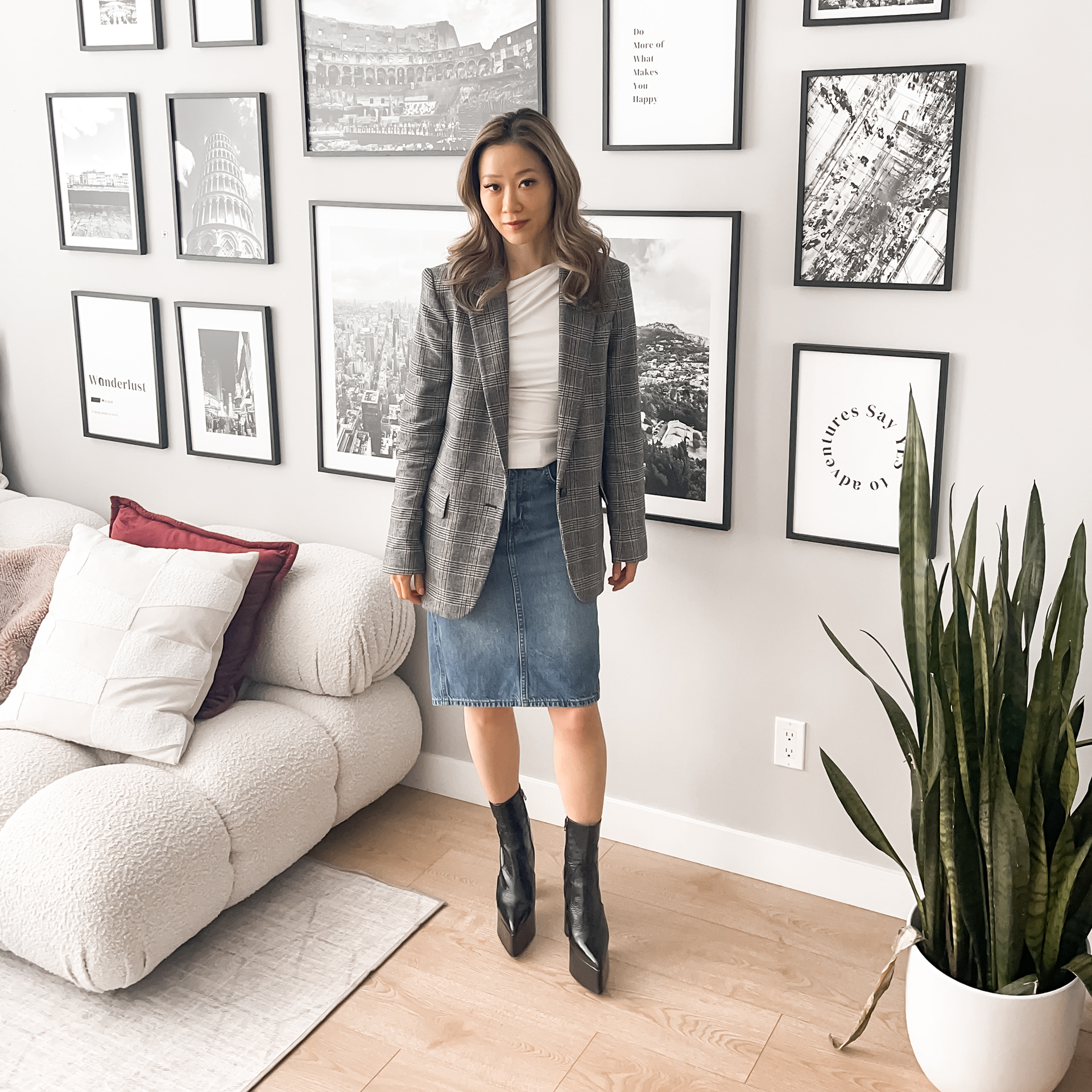 I am in love with this structured plaid blazer as it adds sophistication, while the asymmetric white top brings modern elegance. A classic denim midi skirt grounds the look, and the sleek black pointed-toe boots exudes a bold statement. Perfectly balanced between business casual and street-style cool.