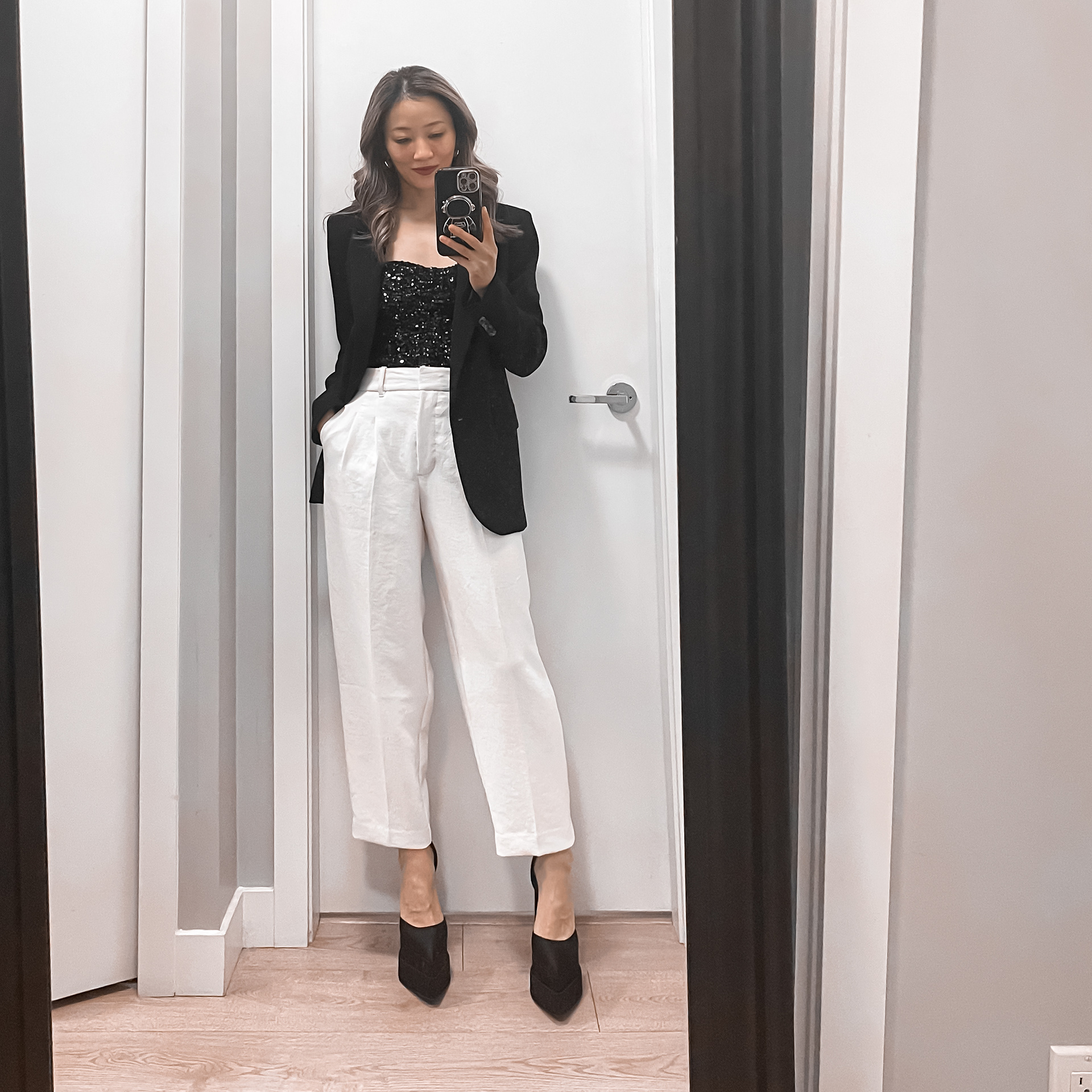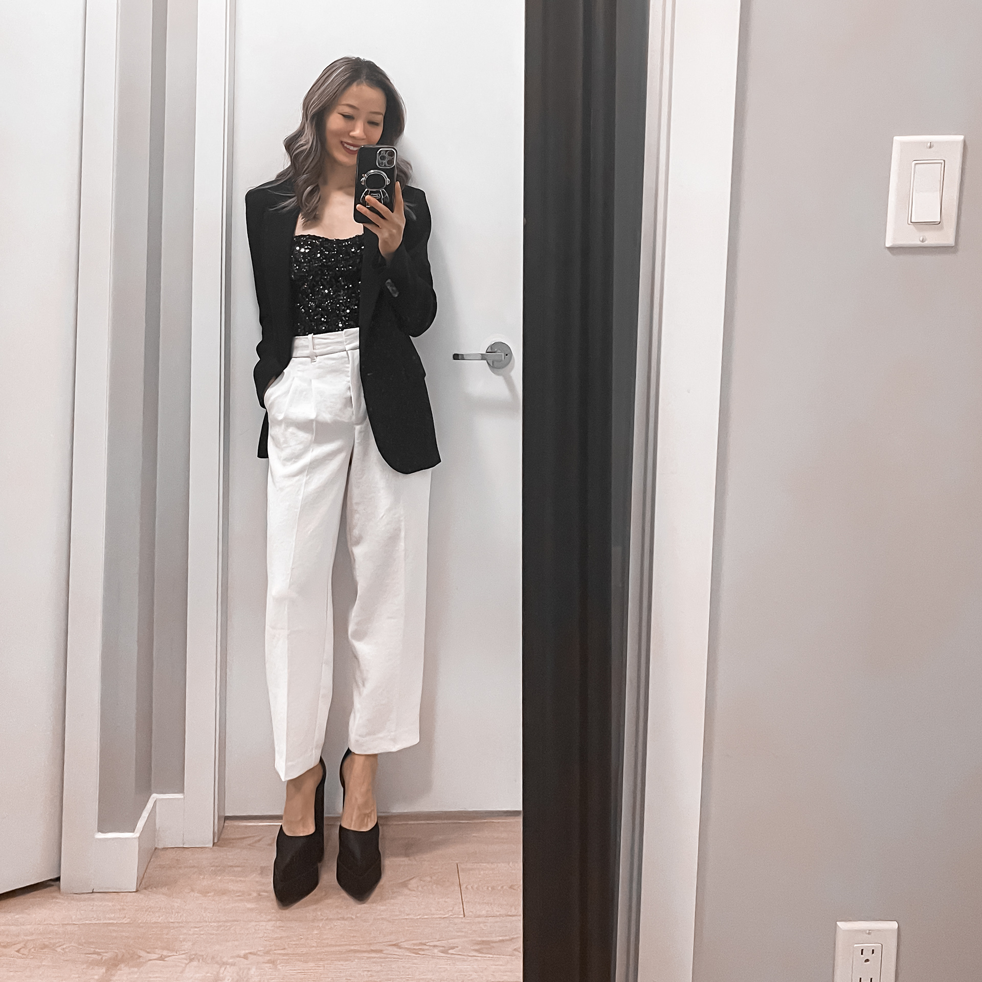 Sleek and sophisticated, I’d throw on a black sequined top paired with a sharp black blazer, exuding a touch of glam. The crisp white trousers add a clean, modern contrast, while the black pointed heels bring an edge of chic confidence.