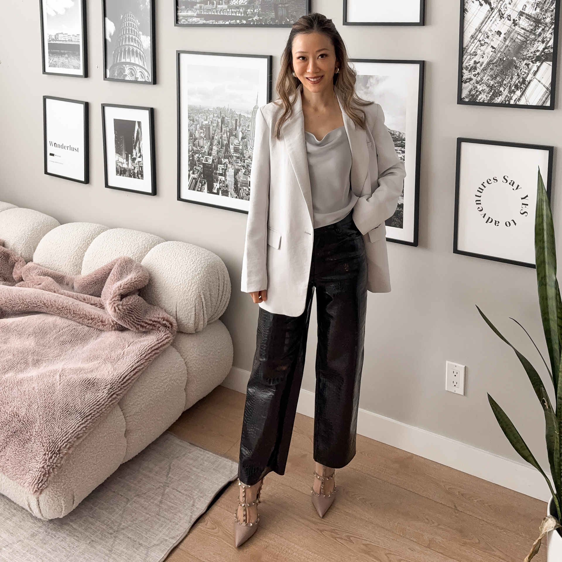 Soft neutrals and bold textures collide in this polished yet edgy ensemble, perfect for a modern power move. I just love blazers.