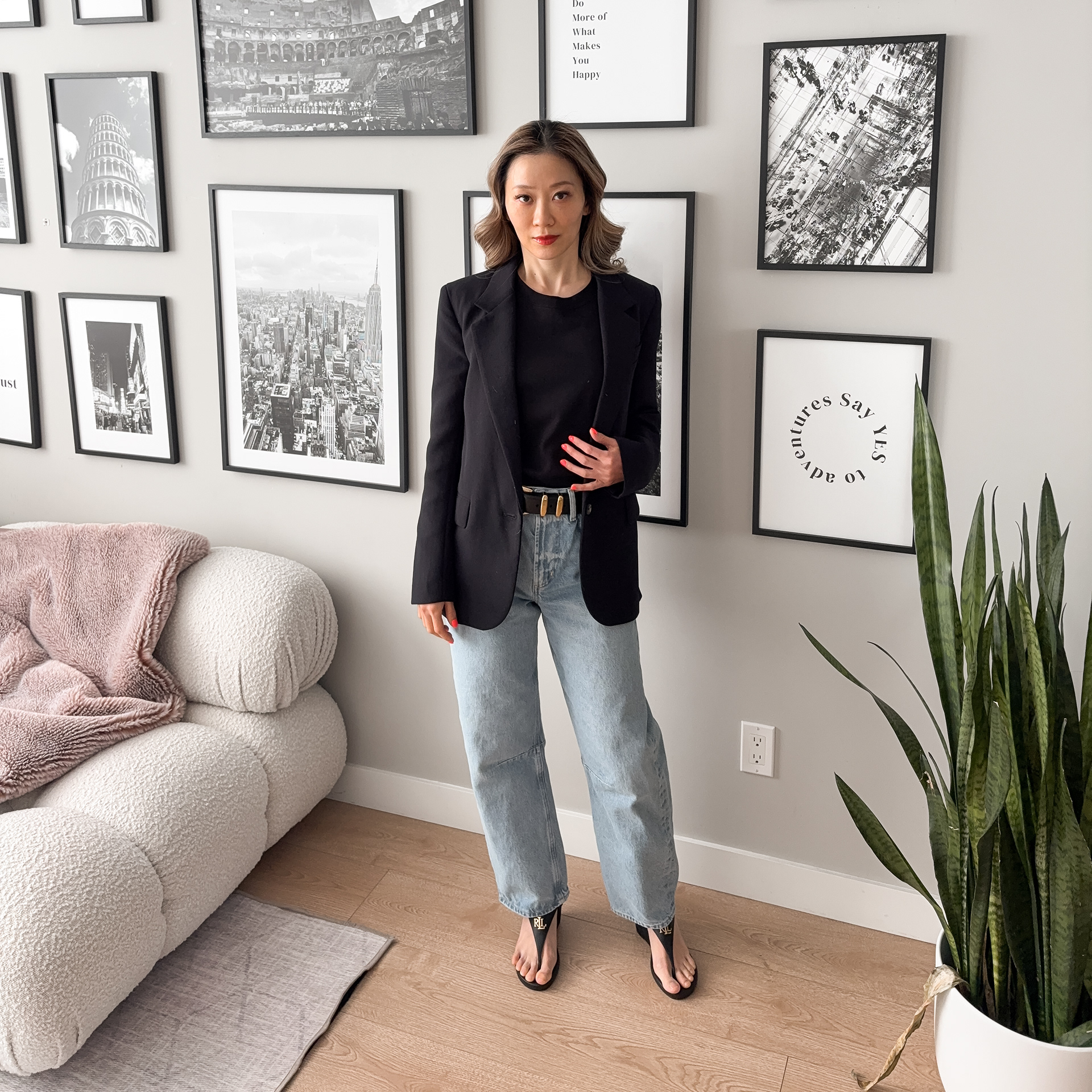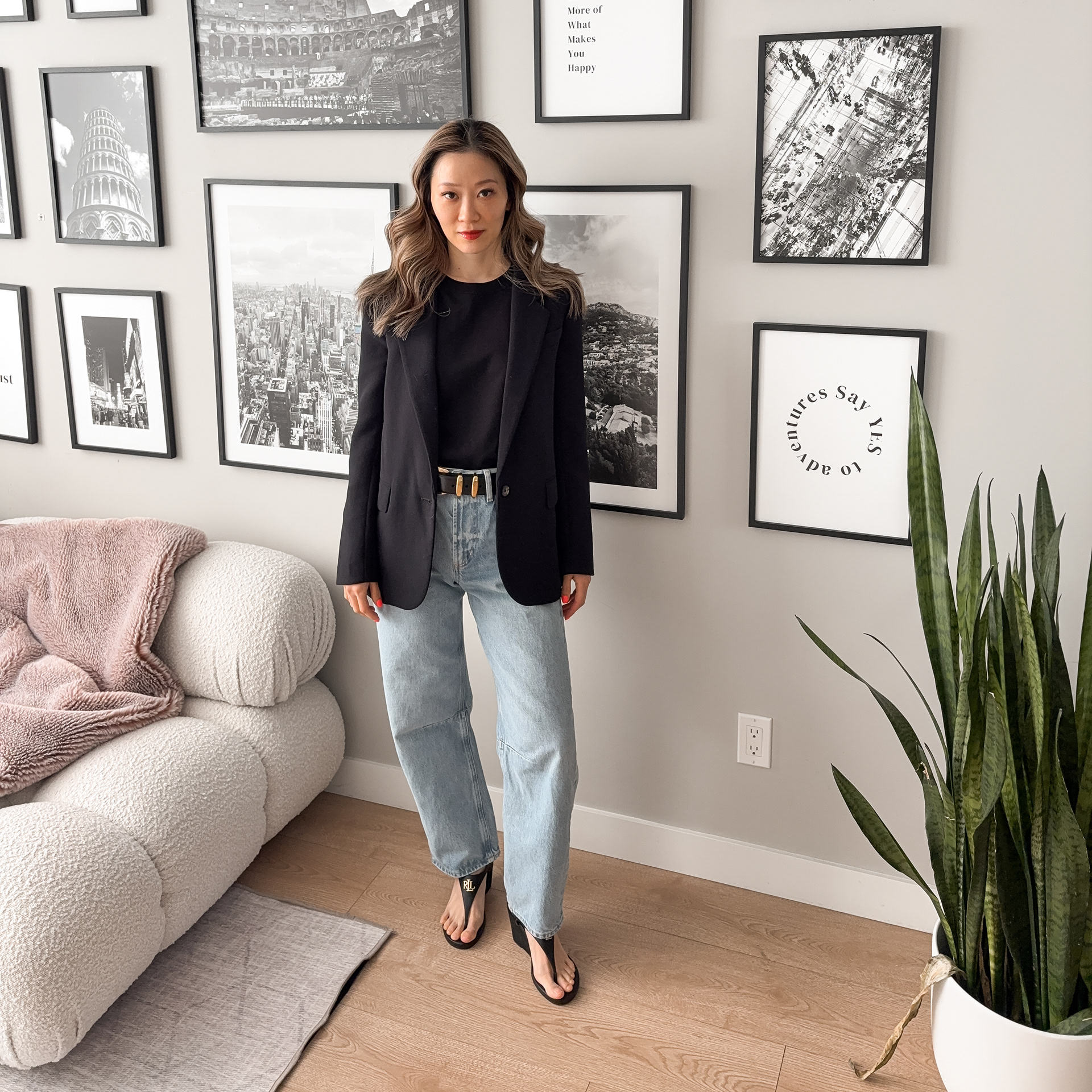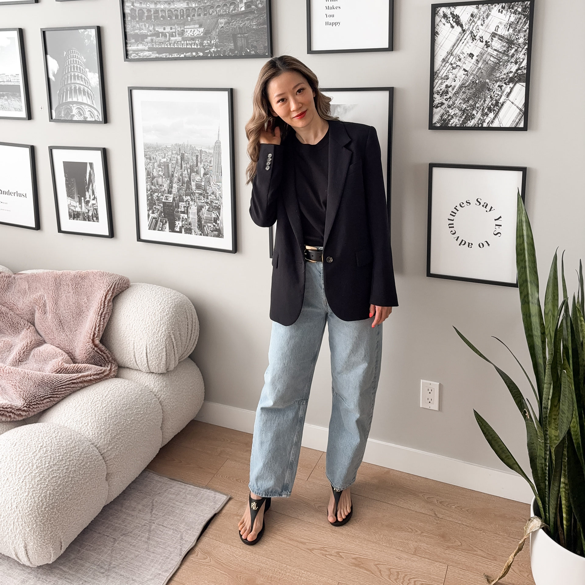 My favourite sharp black blazer elevates the relaxed fit of vintage-wash denim, while a sleek black tee keeps it monochrome chic. Finished with a statement belt and minimalist sandals for a relaxed yet polished vibe.