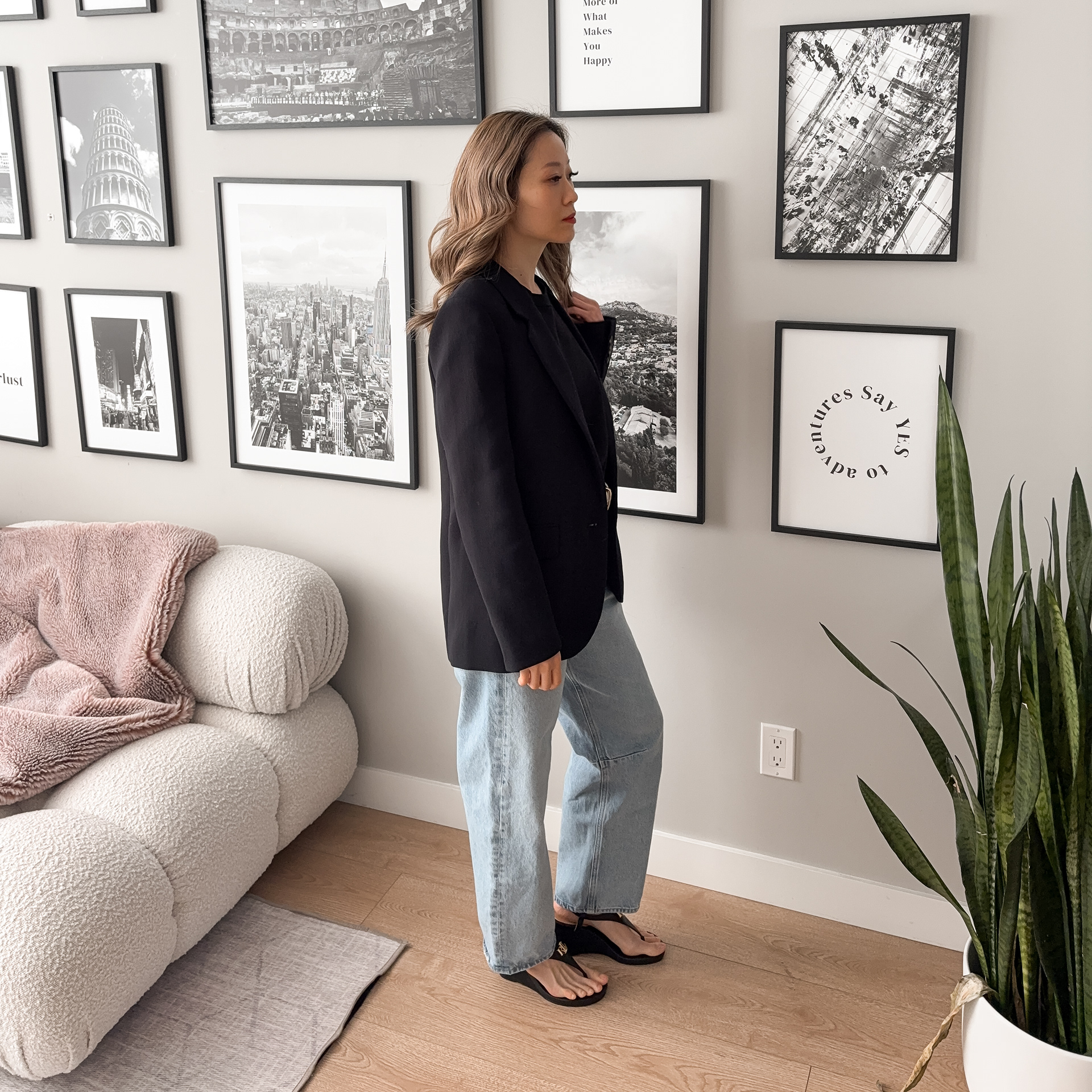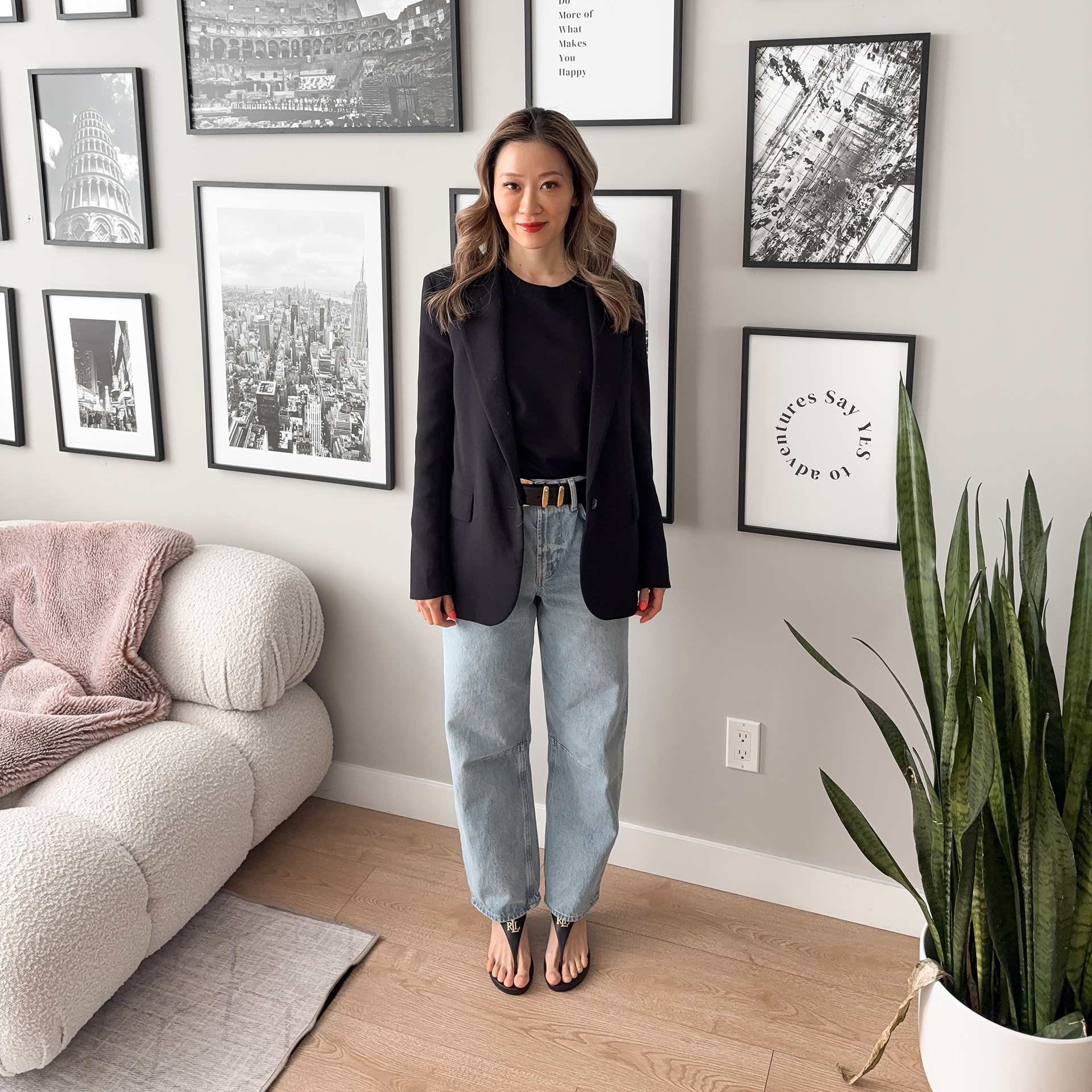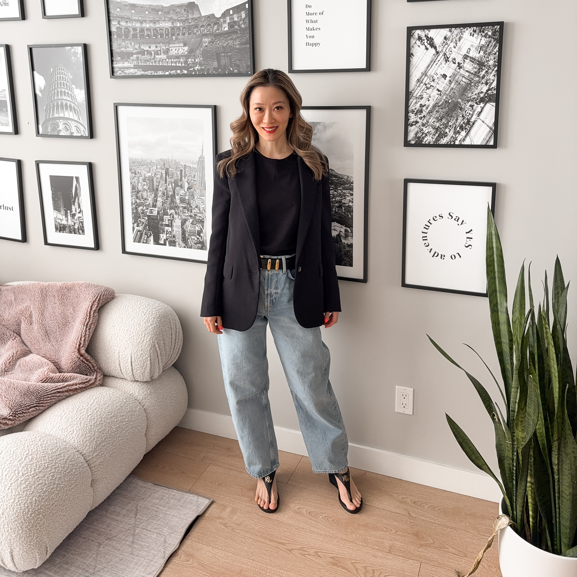 My favourite sharp black blazer elevates the relaxed fit of vintage-wash denim, while a sleek black tee keeps it monochrome chic. Finished with a statement belt and minimalist sandals for a relaxed yet polished vibe.