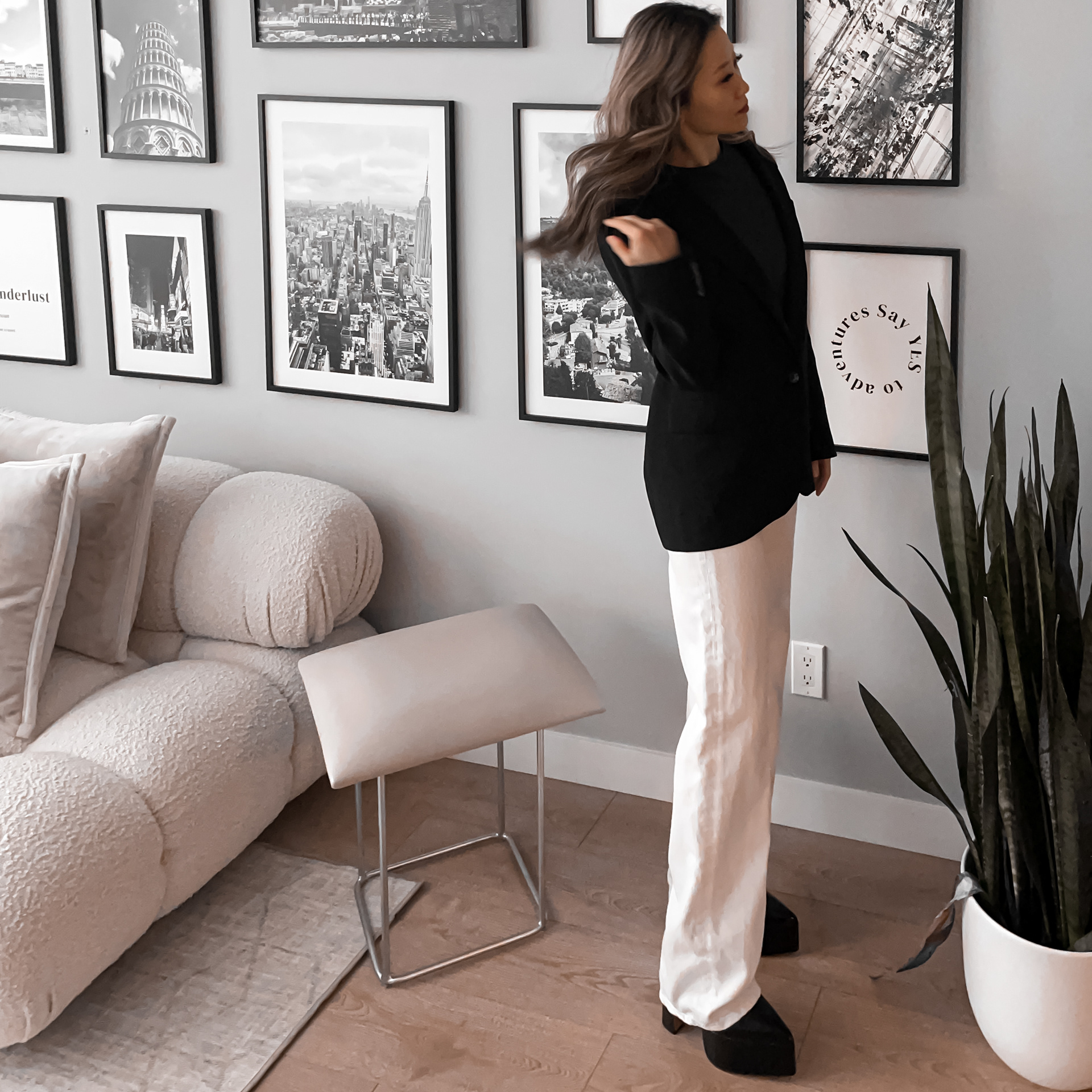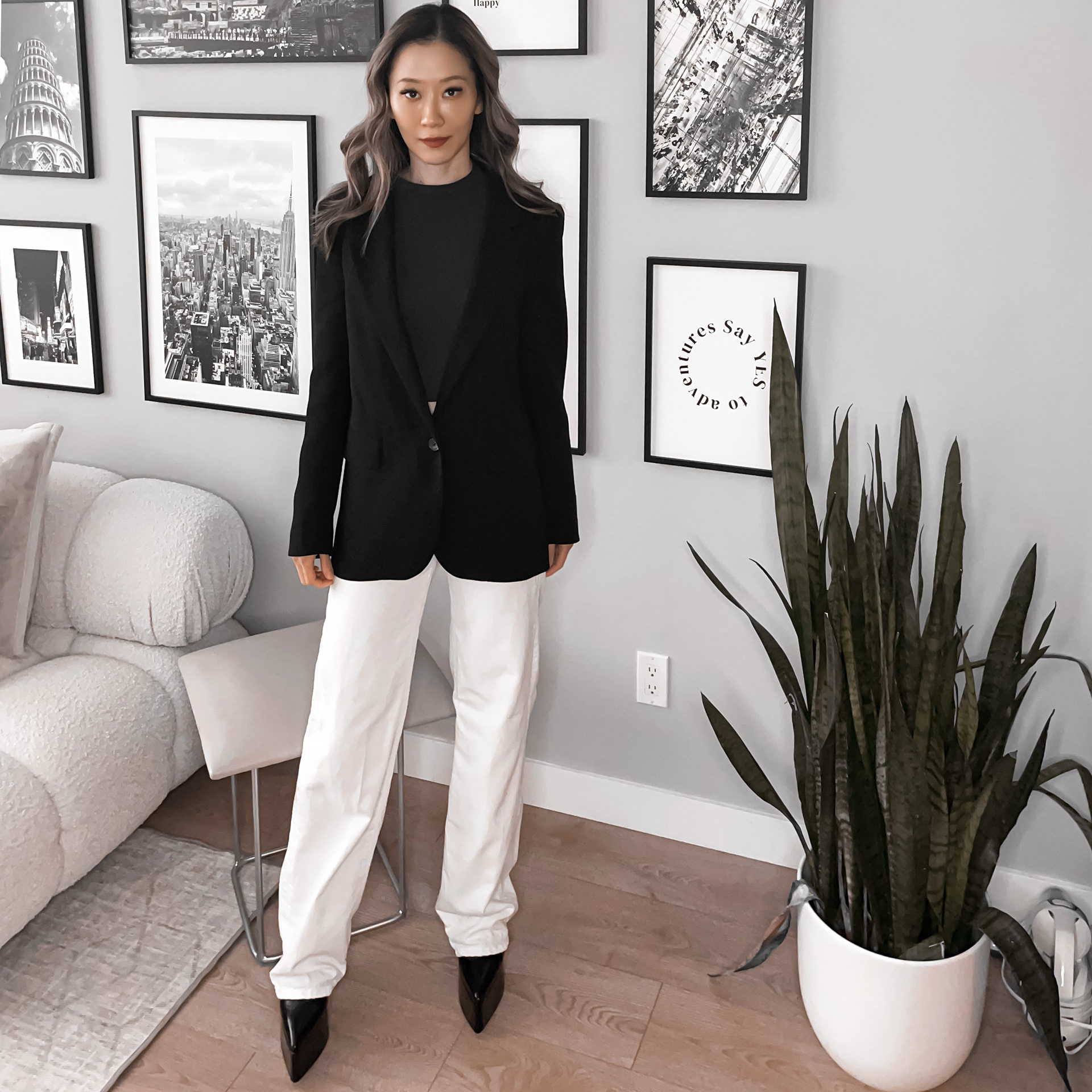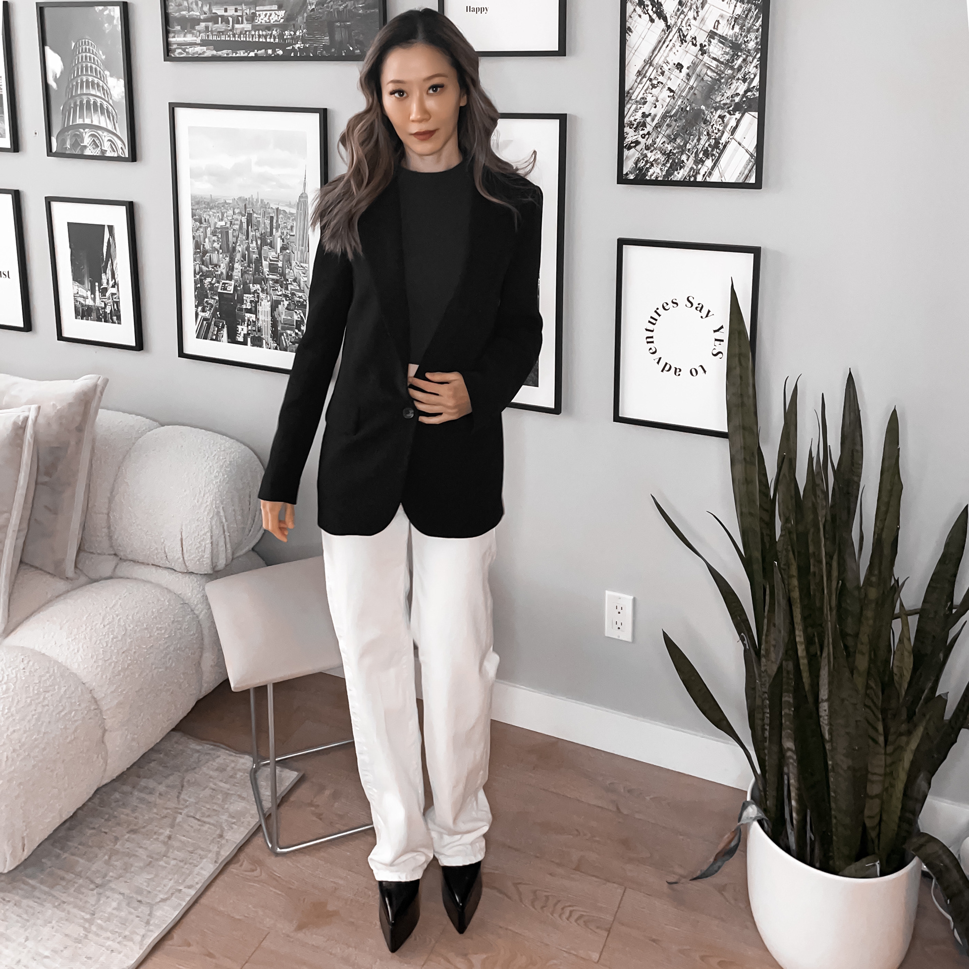 My favourite black blazer and sleek black top create a structured silhouette, perfectly balanced by the relaxed white jeans. Pointed-toe black boots exude a sharp, polished finish. Effortlessly elevated!