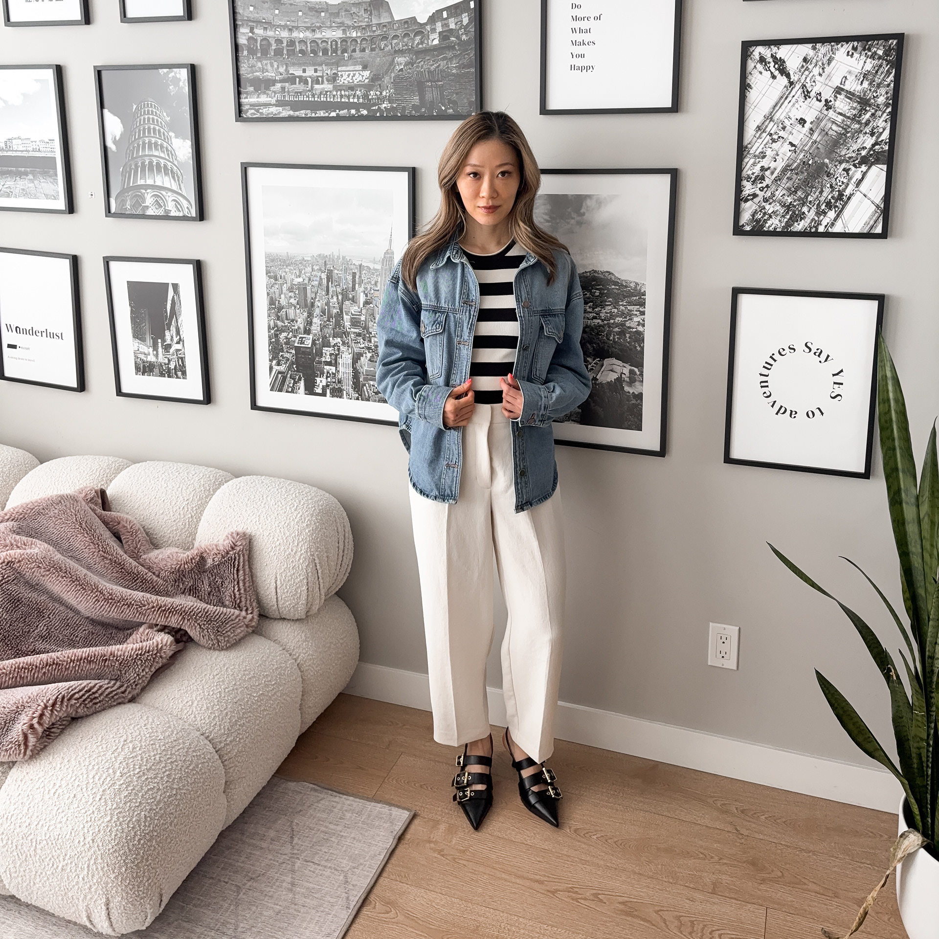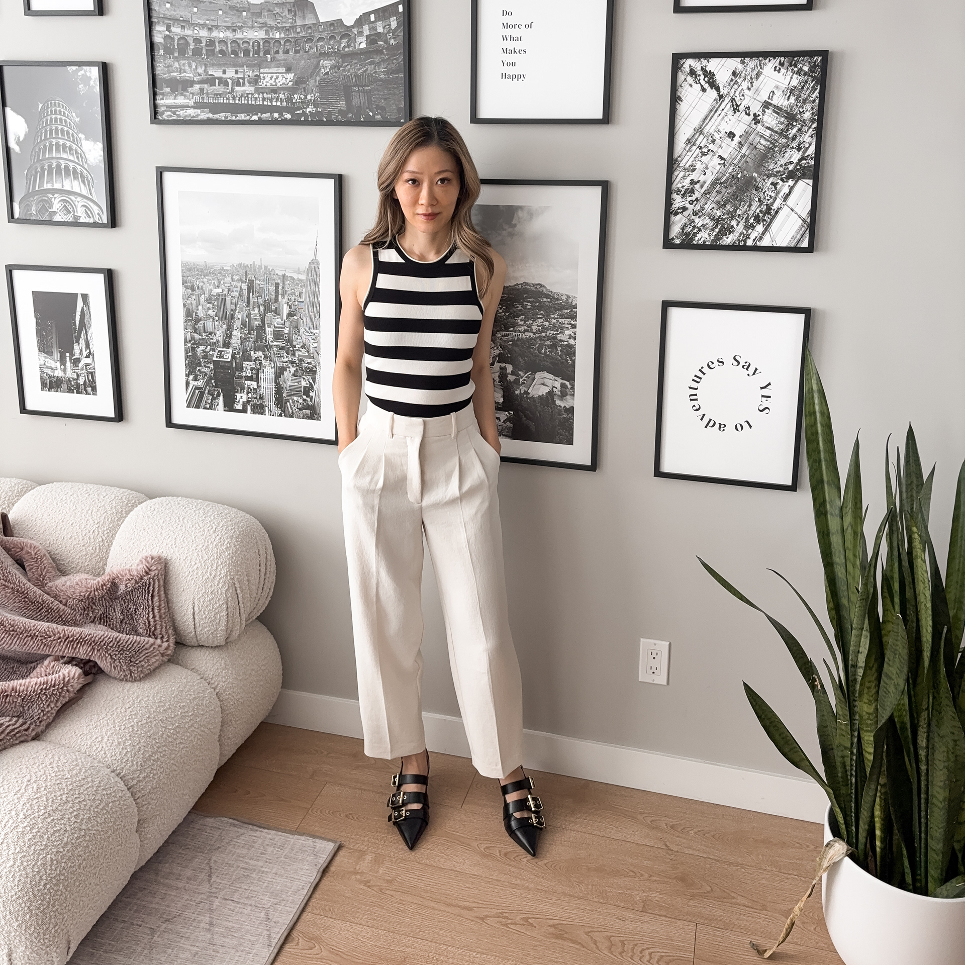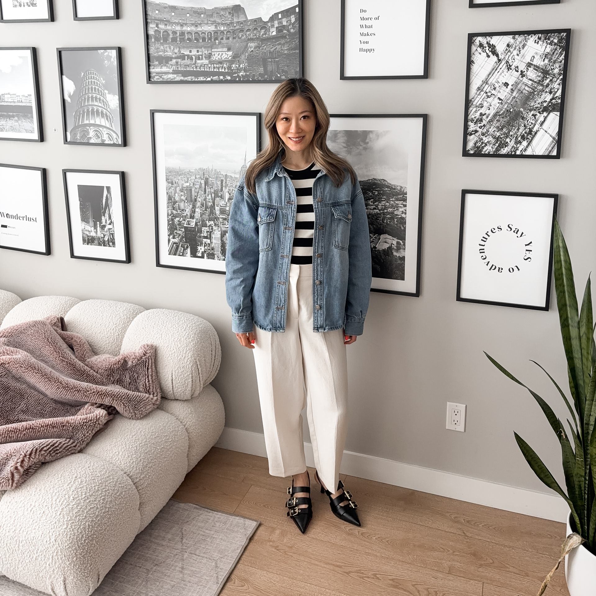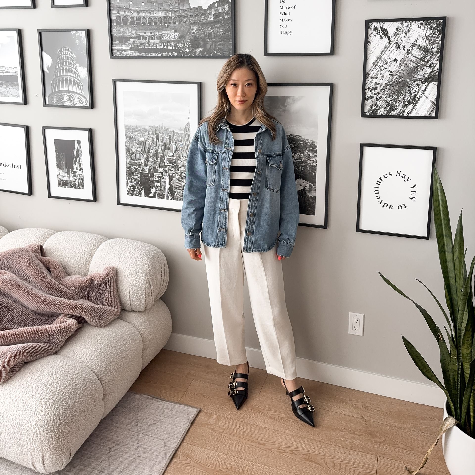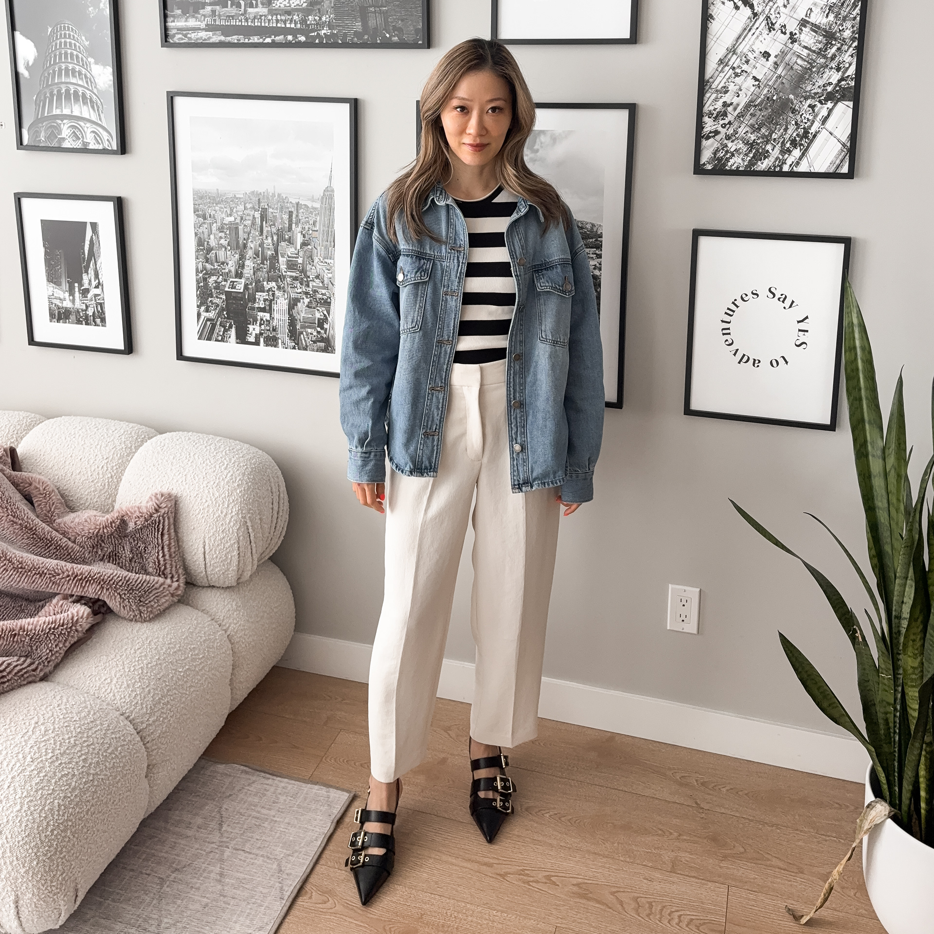This week’s fit is all about sharp essentials and luxe details. A striped tank and pleated ivory trousers form the foundation—polished yet comfortable. Topped with a slouchy denim jacket and anchored by statement buckle heels, it’s the perfect mix of structure and street. Wear it to: morning coffee runs, casual client meets, or Saturday museum strolls. Style tip: Don’t underestimate the power of contrast—mixing tailored lines with oversized denim keeps the look modern.