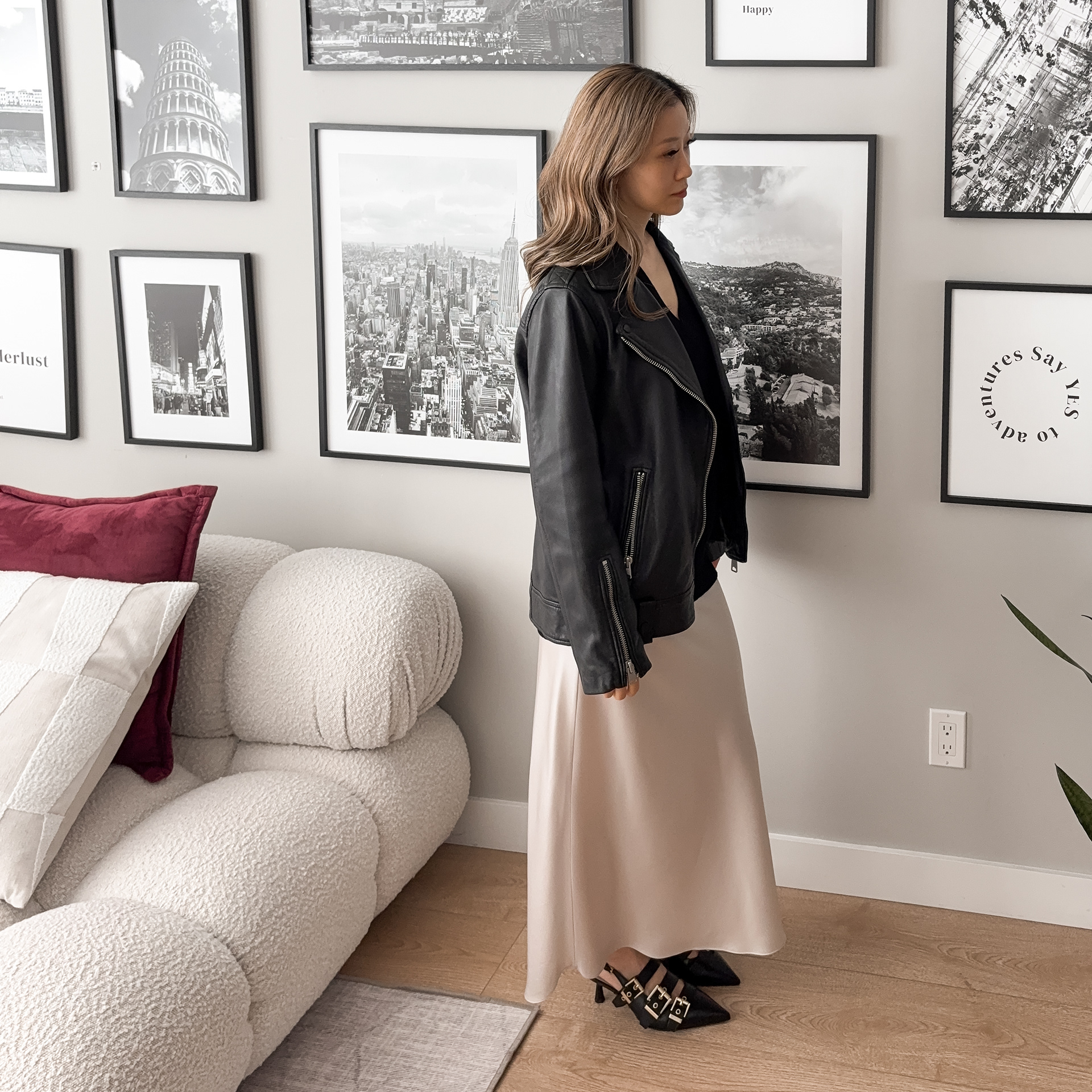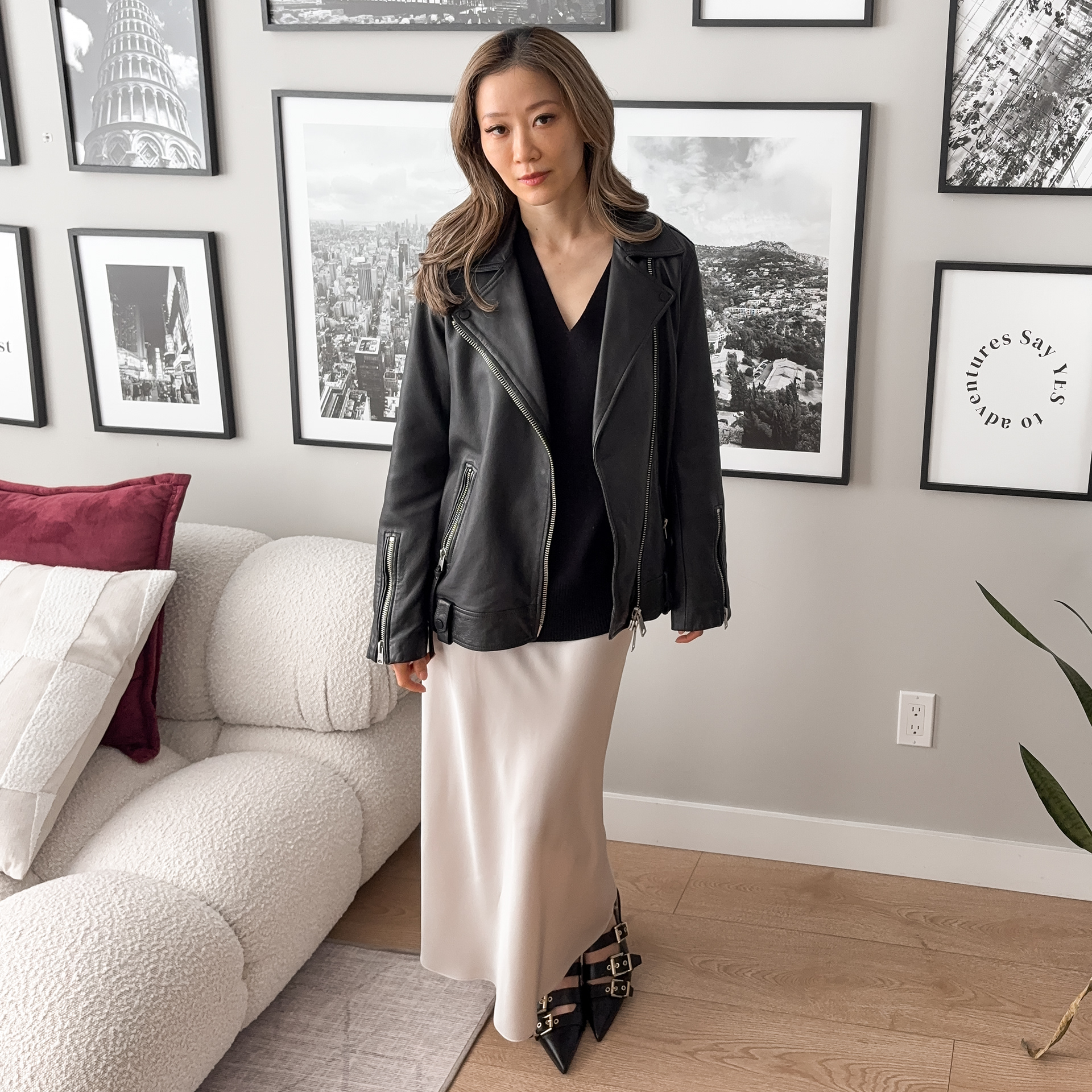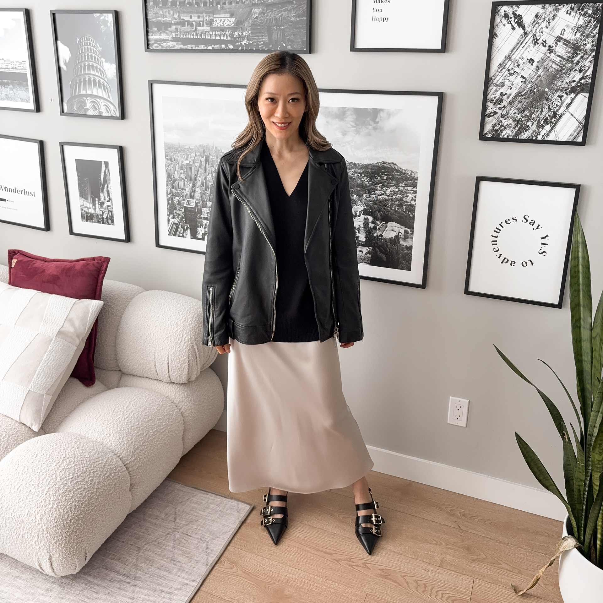 Throwing on the black leather jacket that adds a rebellious contrast to the soft satin slip skirt, creating an effortlessly cool juxtaposition. A sleek V-neck sweater keeps things refined, while the pointed-toe buckle flats bring in a bold, fashion-forward touch. Minimal yet statement-making, this outfit is all about modern sophistication with an attitude.
