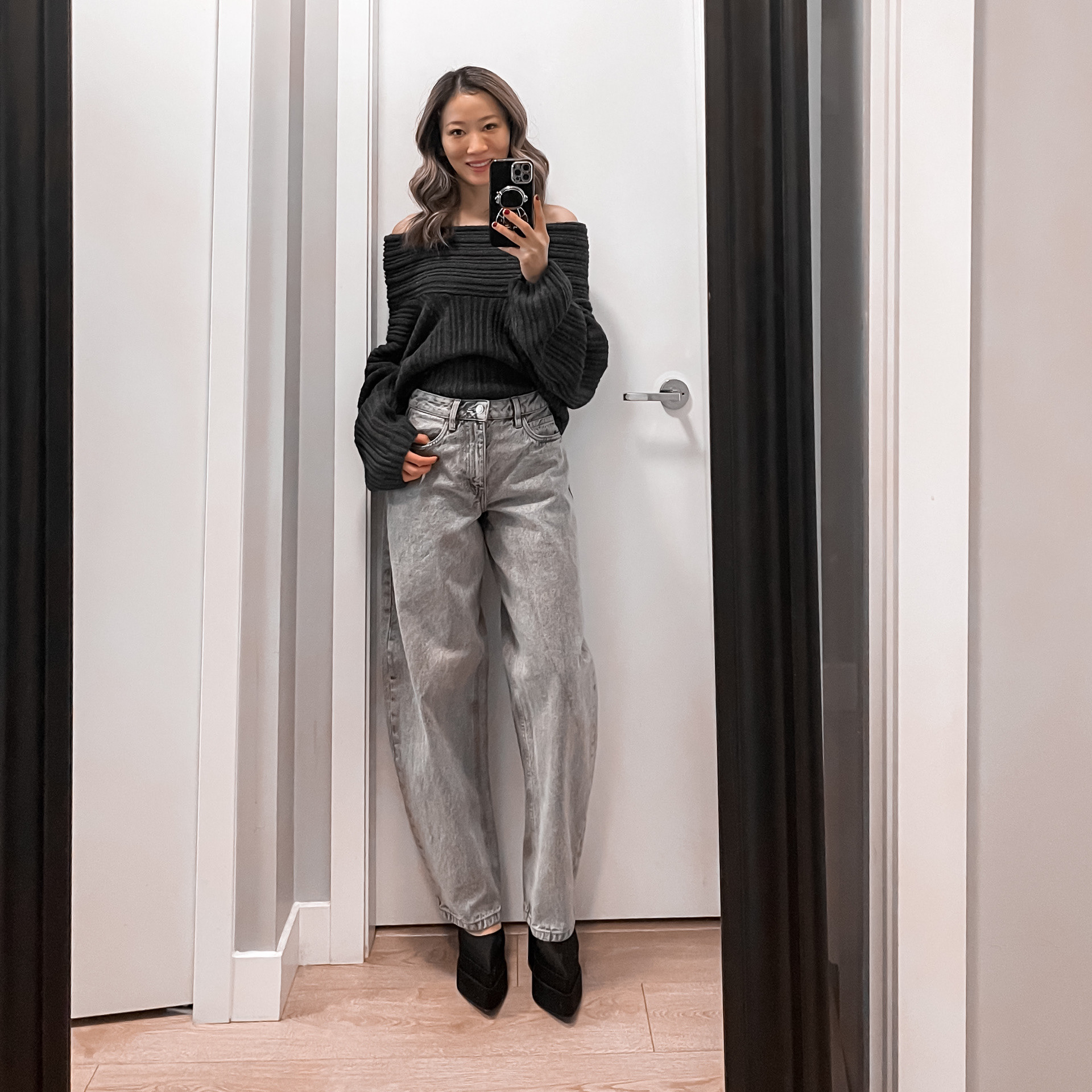 I absolutely love this off-shoulder knit sweater as it gives a subtle feminine flair with cozy sophistication. The relaxed fit and washed texture denim offers a retro-cool aesthetic. This pair of black pointed heels gives a sleek and sharp look, elevating the casual outfit with elegance.