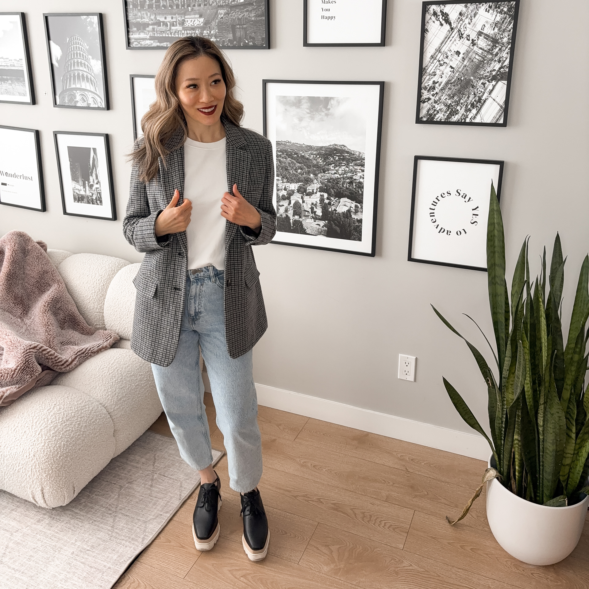 I also love this tailored, gray plaid blazer as it adds a polished touch, paired with a crisp white tee for a clean base. Wearing the high-waisted, light-wash jeans that brings a relaxed vibe, while chunky black platform Oxfords that ground the outfit with a trendy edge.