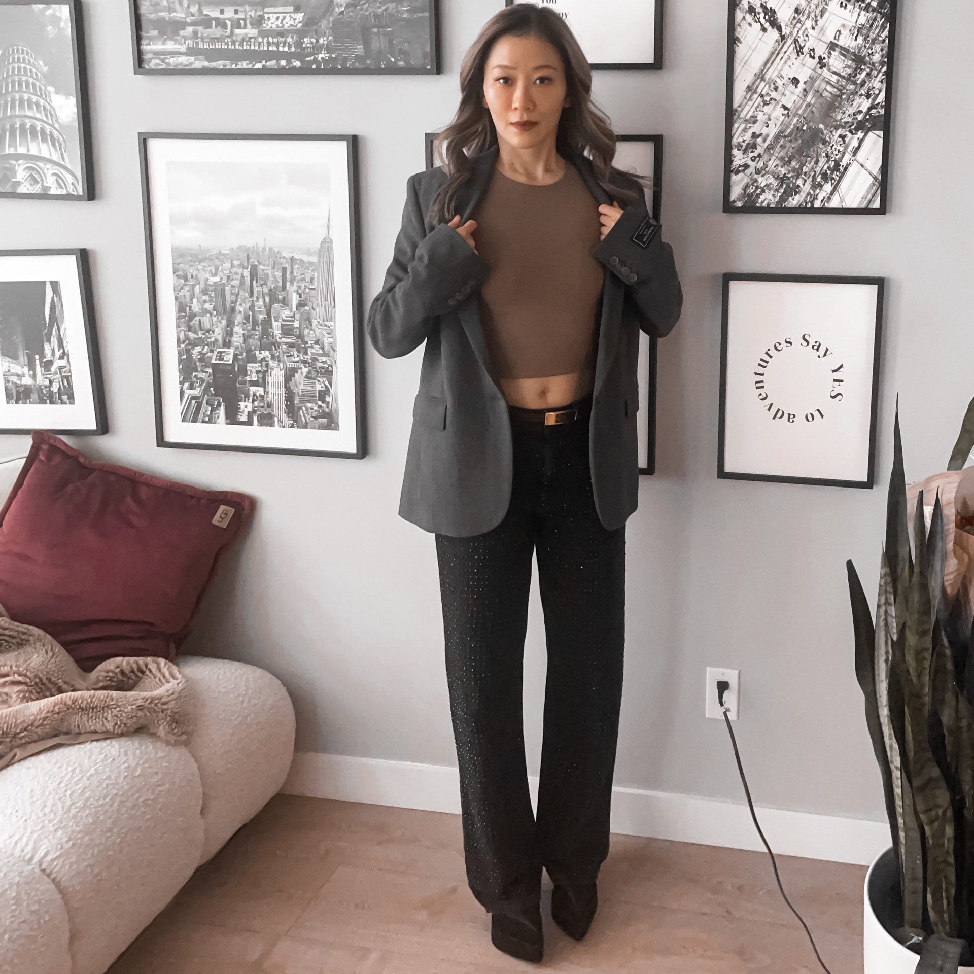 I opted for classic gray blazer paired with a fitted neutral crop top and black denim with black beads. Finished with pointed-toe heels for a sharp, refined edge.