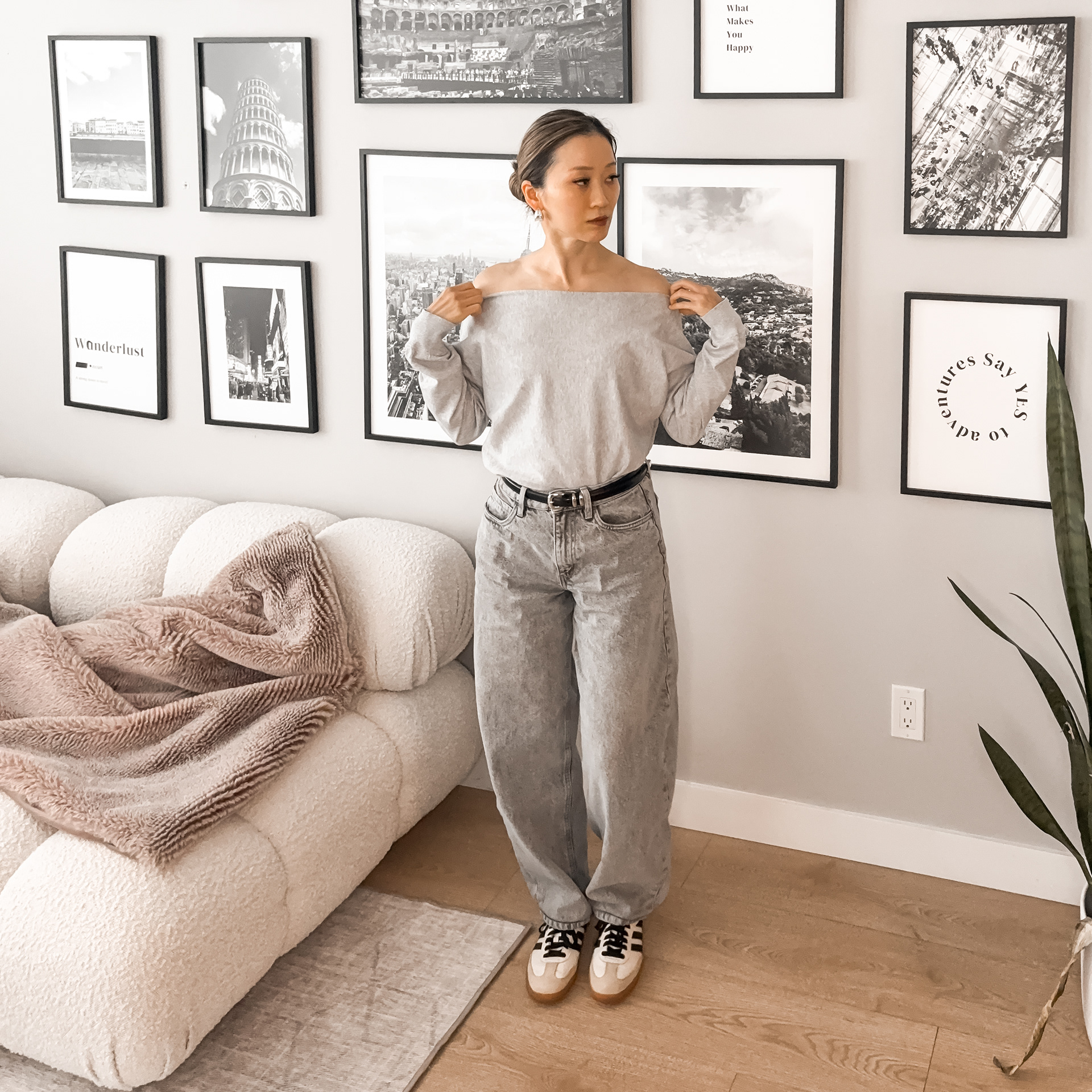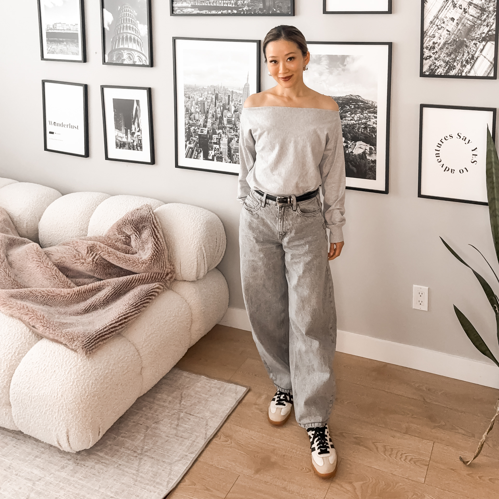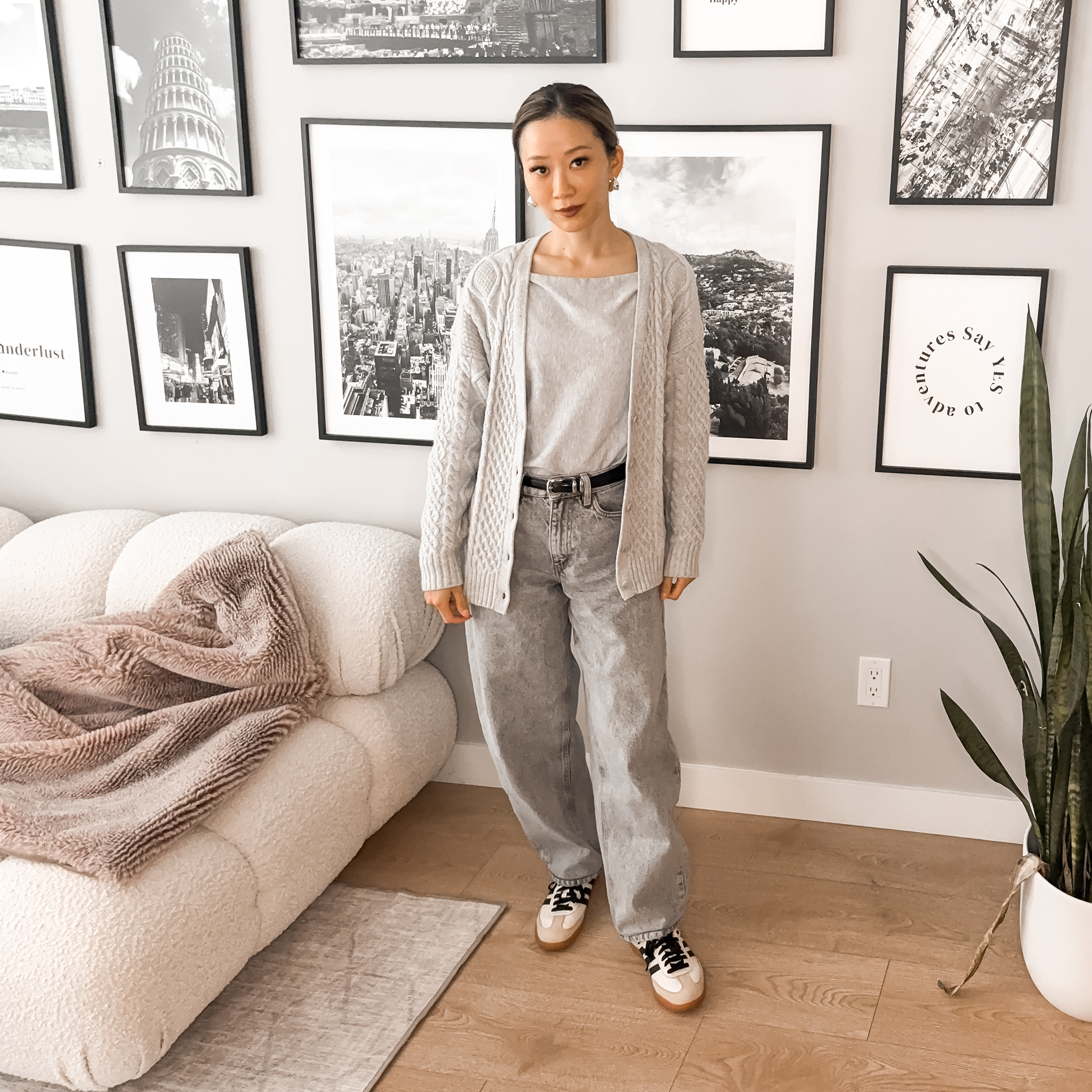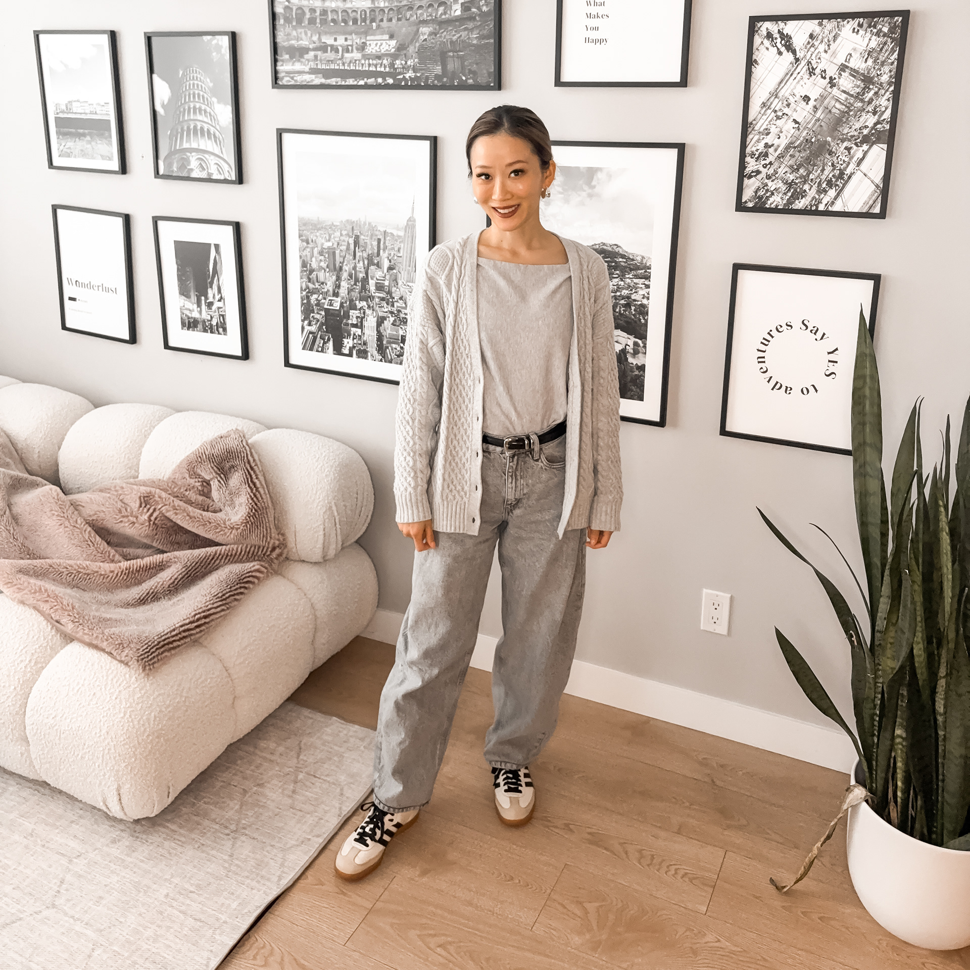 Wearing the classic cardigan, slouchy jeans, and sneakers for an easy, everyday look.