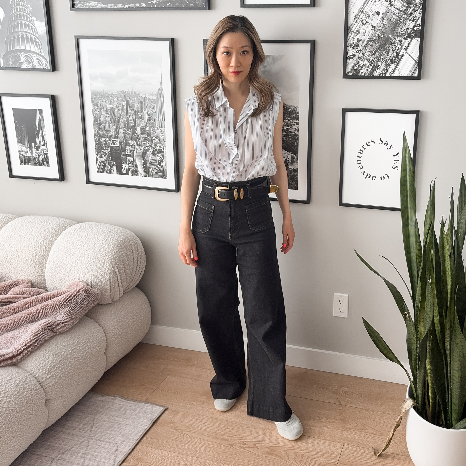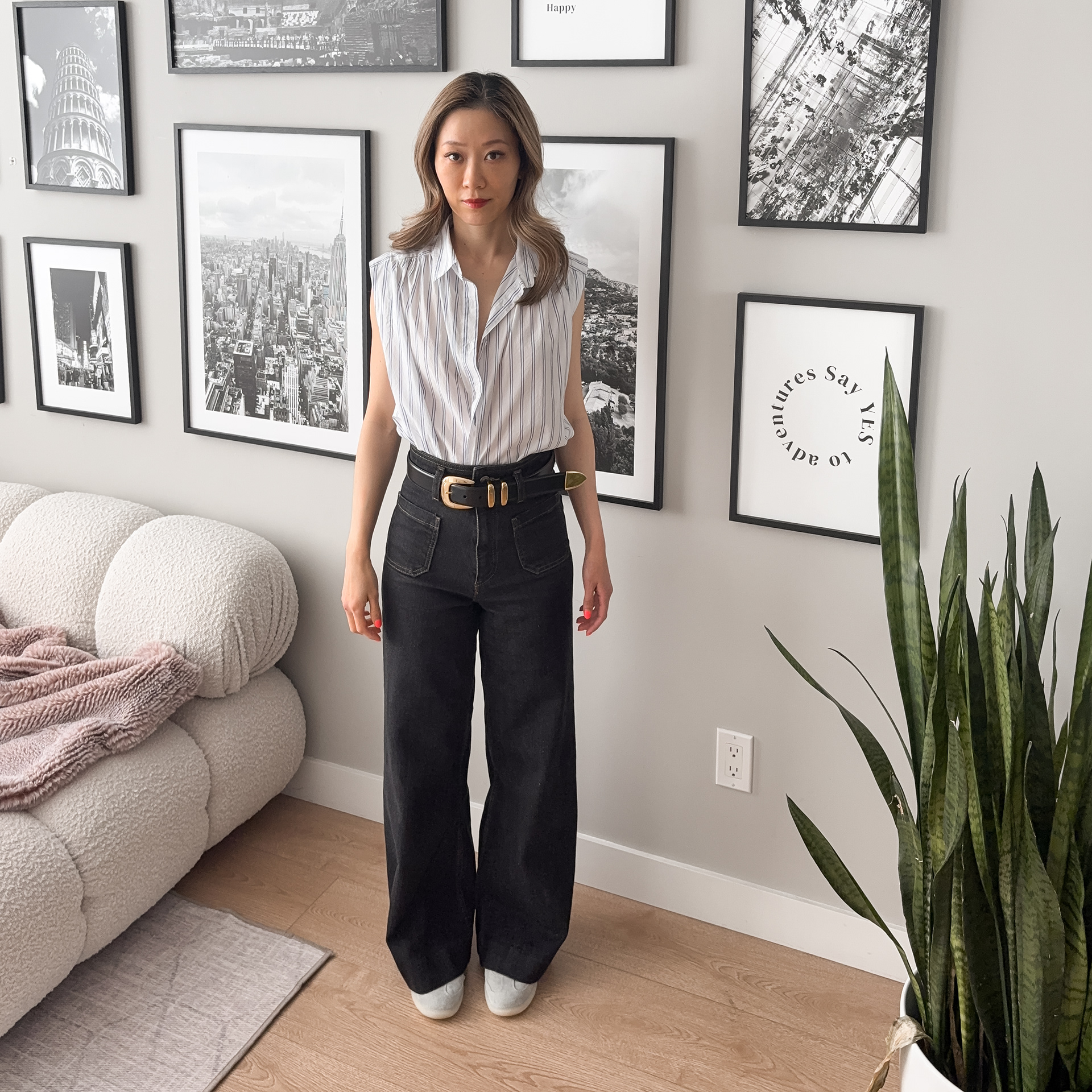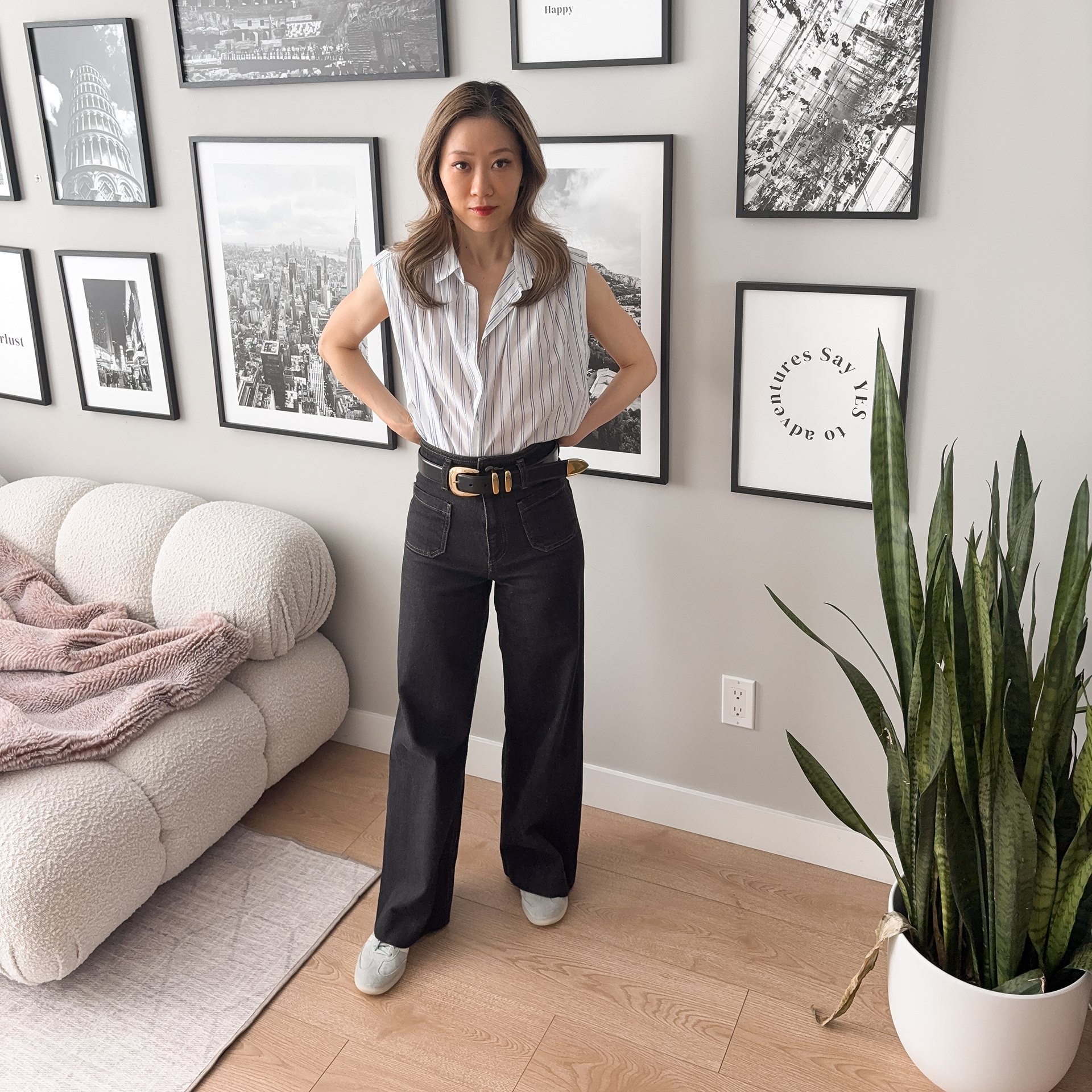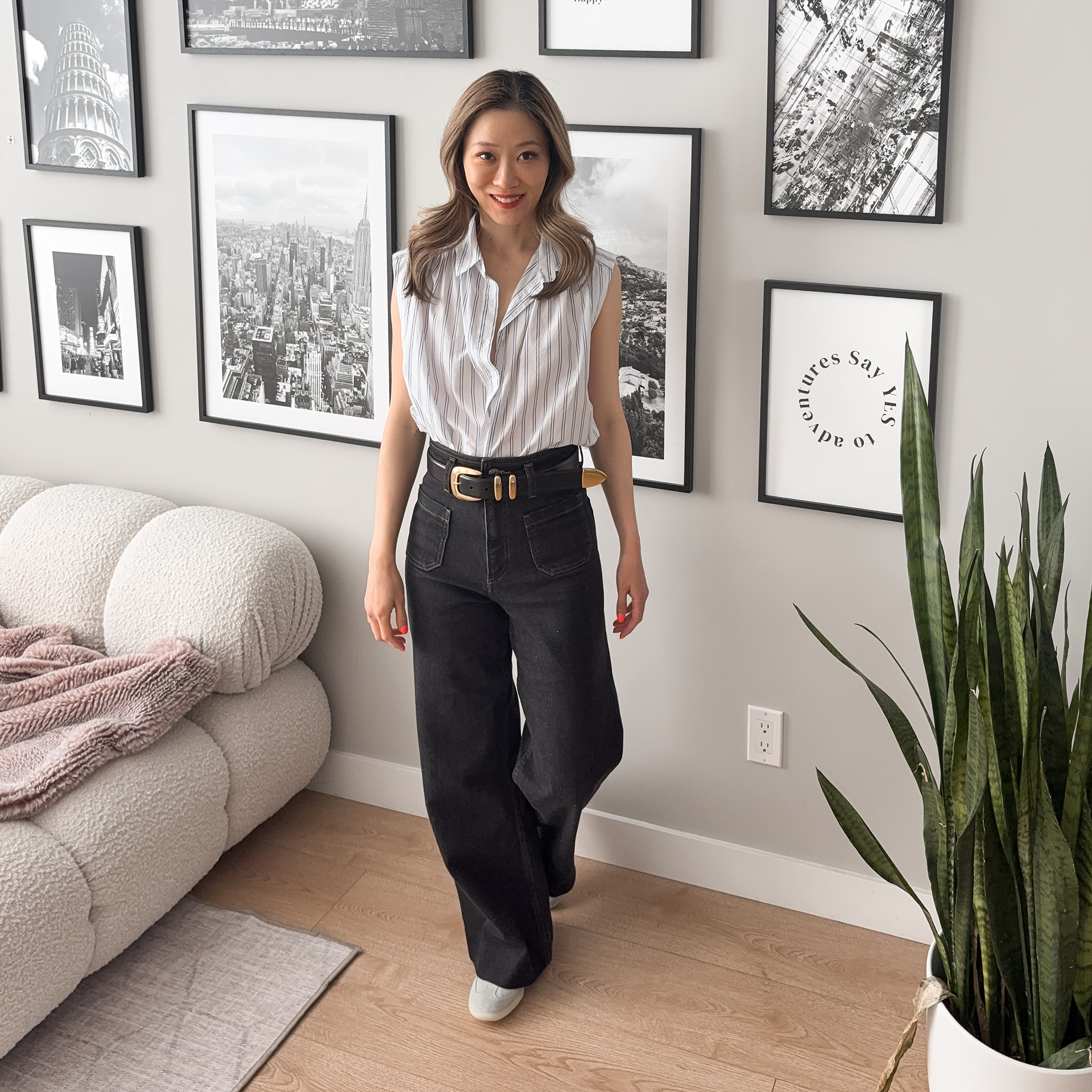 This outfit channels modern polish with a relaxed edge. A sleeveless pinstripe blouse tucked into high-rise, wide-leg black jeans balances sharp structure with soft volume. Anchored by a bold belt and low-profile sneakers, it's a perfect blend of casual confidence and pulled-together power. Ideal for a workday with a creative twist or weekend plans with style.